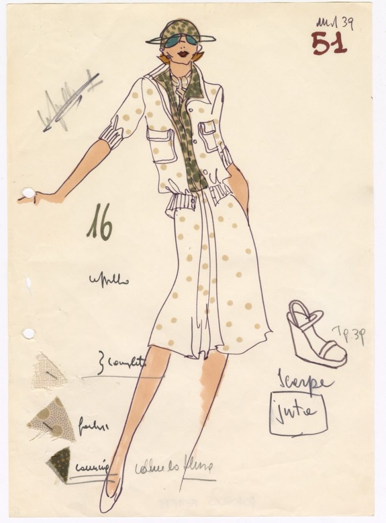 All’interno dell’archivio, il disegno rivela la progressiva costruzione di un linguaggio riconoscibile. Linee morbide, volumi alleggeriti, un rapporto nuovo tra corpo e abito che si allontana dalla rigidità sartoriale tradizionale. La figura femminile, longilinea e dinamica, emerge come fulcro di una ricerca che coniuga libertà di movimento ed eleganza misurata. Parallelamente, il dialogo tra materiali fluidi e strutture più definite anticipa una cifra progettuale destinata a consolidarsi negli anni successivi.