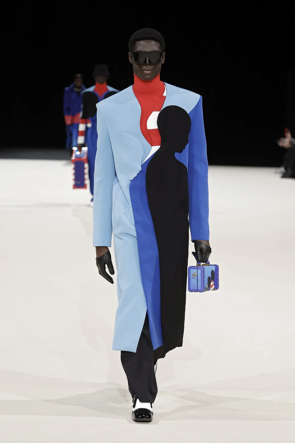 Alcuni look in particolare partono da influenze surrealiste per trasformare, ad esempio, un completo da sera in un viso dove occhi e naso erano stati sagomati nella giacca, mentre la cintura rappresentava la bocca. Finti bouquet floreali erano cuciti direttamente sulle giacche o sostenuti da braccia metalliche legate attorno alla vita. Poi, all’improvviso, il confine tra realtà e finzione sfuma del tutto, in un clash di stampe e colori, un vortice caleidoscopico digitale in cui lo spettatore viene risucchiato.