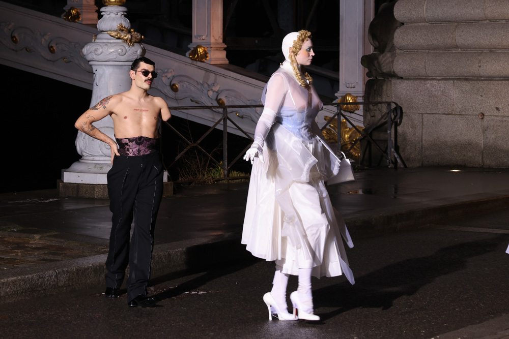 Un “film noir” diretto da Baz Luhrmann precede lo spettacolo, narrando un racconto avvincente di furti di gioielli e inseguimenti polizieschi. Subito dopo il modello Leon Dame apre la sfilata sotto le arcate del ponte avvolte dalla nebbia, con un’altra delle sue uniche camminate “alla Margiela”. Inizia così una performance dal gusto romantico, teatrale e decadente, tipico di Galliano, che ricorda il suo trascorso da Dior e quelle sfilate indimenticabili. Uno spettacolo giocato tra delicati abiti gessati dal taglio magistrale, collari e pettorine bondage in porcellana realizzate dall’artigiano d’arte Robert Mercier, capi con nudità trompe-l’œil, crinoline trasparenti e corsetti abbinati a collant degradé. Il tutto arricchito da copricapi, frutto della maestria artigianale dell’iconico Stephen Jones.