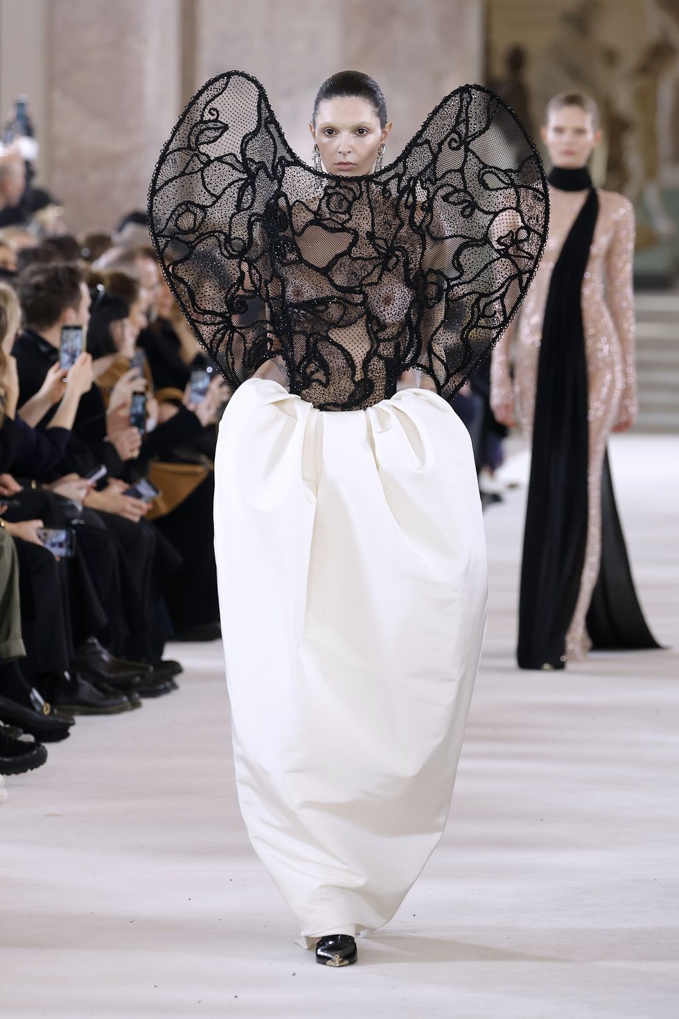 Volumi ultraterreni, con particolare focus sulle spalle e ornamenti tanto preziosi quanto curiosi, a coprire abiti e volti. Giacche scultoree profilate da finte trecce di cavallo. Maestosi e inquietanti al tempo stesso, i look della collezione Schiaparalien mettono in scena un dialogo tra passato e futuro, dove si accenna anche alla vita extraterrestre. Quest’ultimo punto è un omaggio allo zio Giovanni di Elsa Schiaparelli, astronomo che scoprì per primo una sorta di Grand Canyon su Marte, inventando il termine marziano.