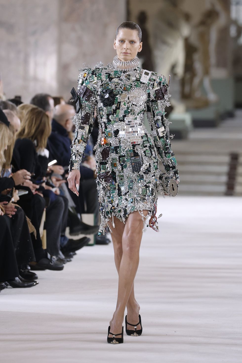 Lontano dall’essere didascalico, Roseberry gioca con silhouette e tessuti dando vita a capi che si muovono sul confine tra il familiare e ignoto, dall’aspetto poco rassicurante, ma molto affascinante. Dettagli, accessori e hardware rimandano al mondo dei cowboy (origini texane del designer), mentre il cocktail dress protagonista della collezione è stato realizzato fondendo componenti tecnologiche superate (pre iPhone). Vecchie schede madri, chip, cavi, componenti in plastica, una ventola di raffreddamento all’altezza del cuore e gioielli preziosi che si confondono nello scintillio del ferro e del rame. Una sorta di esoscheletro elettronico, dal gusto però squisitamente moderno.