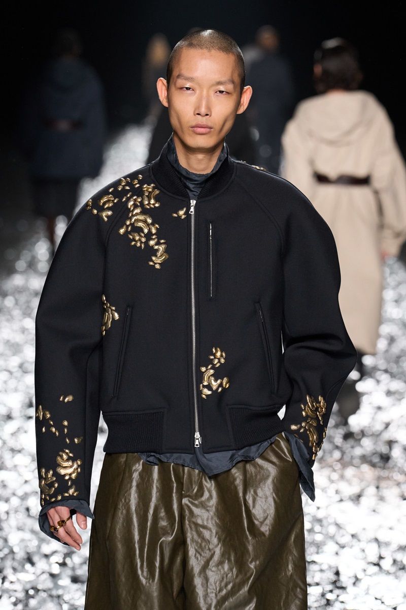 La collezione presenta tanti temi e tecniche care al designer: le stampe con foglie e petali, l’animalier, l’oro spalmato sui pantaloni o in tie-dye sugli orli delle giacche fino ai ricami in oro sui giubbotti. Non solo una sfilata di addio, ma anche un finale aperto per chi verrà dopo di lui a scrivere il sequel di uno dei brand più amati dagli insiders e clienti, che negli anni ha saputo trovare il giusto equilibrio tra ricerca e successo commerciale, sempre all’insegna di una comunicazione low-profile.