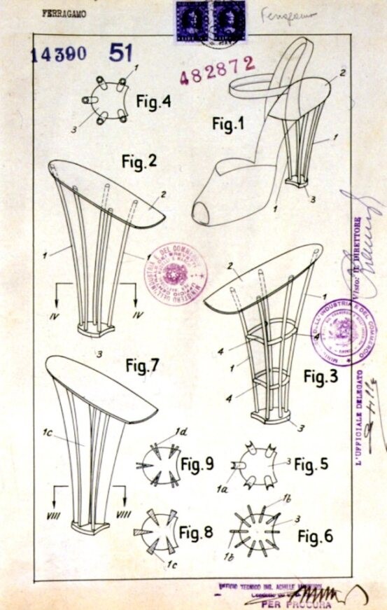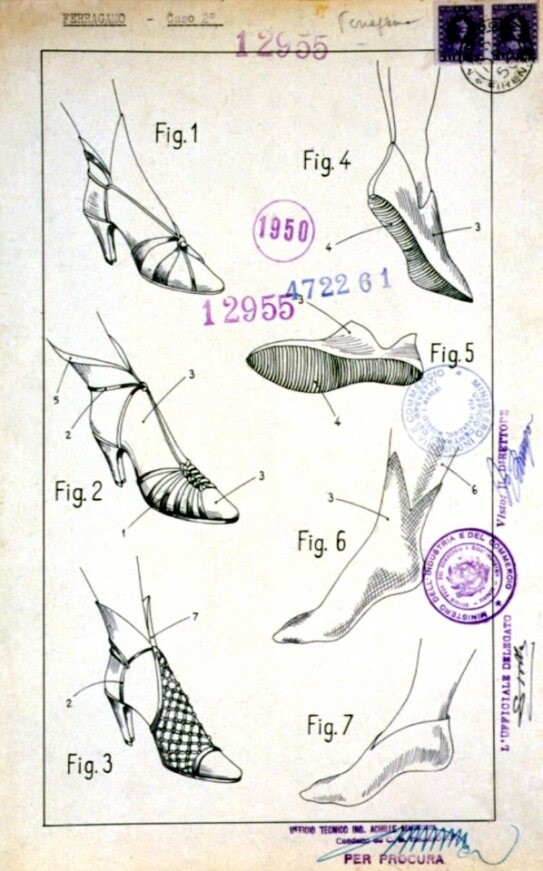 Forme architettoniche presenta scarpe selezionate per la loro forma architettonica, evidenziando l’approccio funzionale e estetico di Ferragamo. Brevetti, mostra invece i certificati che lo stilista ha ottenuto nel corso della sua vita, dimostrando la sua attitudine progettuale nel settore calzaturiero. Nuovo Rinascimento sottolinea il legame di Ferragamo con la tradizione artigiana fiorentina, mostrando un sandalo in oro a 18 carati creato nel 1956, mentre Creatività a colori evidenzia l’uso disinvolto dei colori da parte di Ferragamo, influenzato dalle avanguardie artistiche e dalle sue radici italiane e californiane.