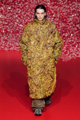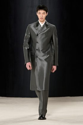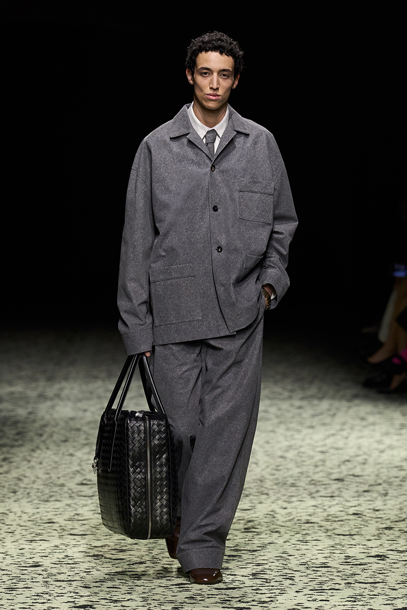 Nella processione – invero stilosa – di Bottega Veneta saltano, perciò, gerarchie, denominatori comuni, rimandi tra le uscite, a prendersi la scena sono, invece, gli outfit di sopraffina qualità citati, ovvero – per lei – dress scivolati, pull XXL a trama grossa, set coordinati solcati da embroideries, per lui pajamas dall’appeal formale, pantaloni décontracté, maglie lunghe fino ai piedi, a mo’ di tunica, per entrambi una sfilza di impermeabili dal piglio vagamente militaresco, che esibiscono spalle sagomate e fit sciancrato, stretti in vita da cinture tono su tono, e ancora frange, applicazioni, inserti a contrasto, in una mescolanza di codici, volumi e tecniche che rendono merito all’abilità degli artigiani BV, dispiegata nell’intreccio paradigmatico del marchio (che la fa da padrone, ovvio, sulla pelletteria), nei ricami in seta handmade, nei manici in vetro soffiato della borsa Sardine, nel profluvio di squame e piume.