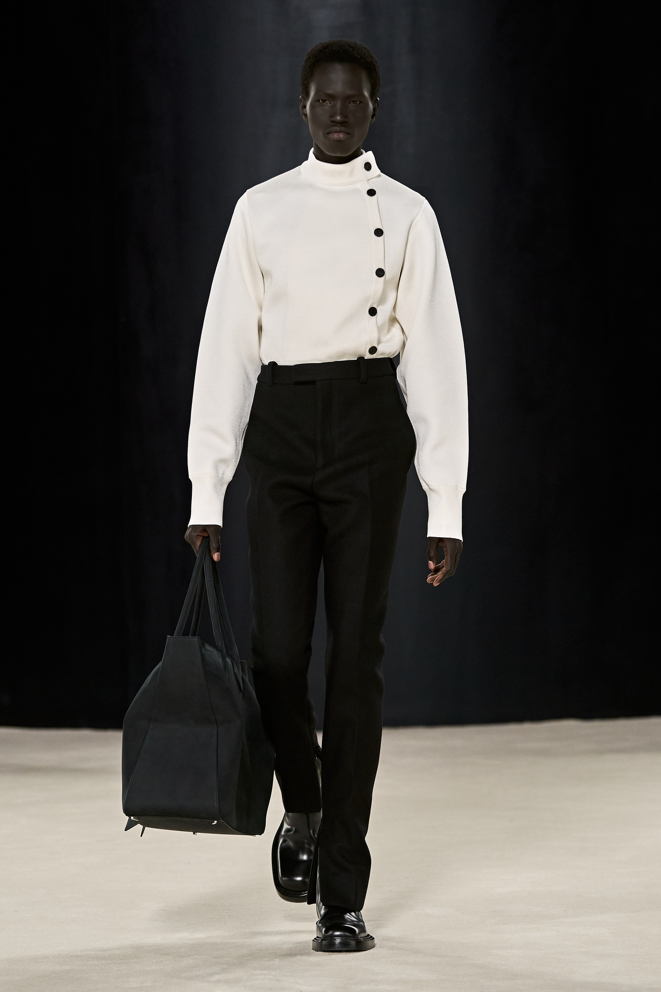 Alla sua terza prova da designer della griffe vicentina, si delinea con chiarezza via via maggiore la direzione impressa da Matthieu Blazy allo stile firmato Bottega Veneta: tutto ruota intorno a creazioni artigianali di squisita fattura, che poco o nulla concedono alla spettacolarità fine a se stessa, al coup de théâtre buono solo per la passerella, lasciando che a parlare siano la pregevolezza senza pari dei materiali, l’eccellenza delle lavorazioni, la vestibilità lusinghiera e, non ultimi, i tocchi inaspettati che suggellano la straordinarietà – nel senso letterale della parola – dell’abito o accessorio di turno.