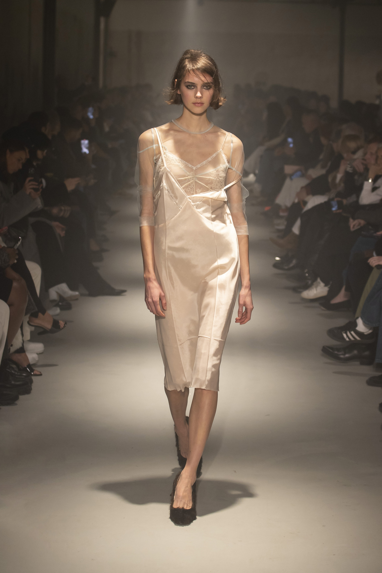 L’orizzonte di riferimento è il cinema degli anni ‘60, che sublimava in attrici alla Jeanne Moreau o Monica Vitti i fermenti del tempo, la voglia diffusa di liberarsi di norme e abitudini (anche) vestimentarie percepite come opprimenti. Tutto ciò si traduce, sul catwalk, in un esercizio stilistico teso a esaminare – e rileggere – shape, proporzioni, resa degli outfit. D’altronde, da N°21 gli opposti si attraggono, integrandosi alla perfezione, perciò la sottoveste s’indossa con pullover e filo di perle, la camicia con la gonna in satin laccato, gli shorts con l’overcoat di foggia maschile; négligé, bluse trasparenti e altri archetipi dell’abbigliamento da camera, equiparati ai grandi classici del prêt-à-porter, sono declinati in versioni sontuosamente decorate, tra ricami intricati, riflessi cangianti, filati brillanti, mentre bra e culottes occhieggiano qua e là, evidenziate da una spallina artatamente scesa o un orlo troppo corto.