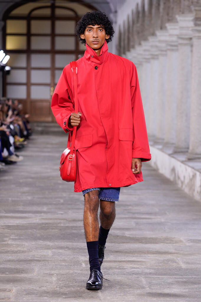 Bellotti ha lavorato su un interessante concept richiamando a quel cenacolo di irregolari bohèmiens che era il Monte Verità, un rifugio utopico di intellettuali alternativi e anime creative che si stabilirono ad Ascona, in Svizzera, all’inizio del XX secolo. Il loro approccio libertario, che rifiutava il peso di un’esistenza urbana per una comunione olistica con la natura, fu una rivoluzione culturale che influenzò letteratura, danza, pittura e performance. E sicuramente si evince un approccio più libero alla moda, anche se a livello di silhouette tutto resta molto timeless classic ed essenziale. Interessante e più giocoso l’uso dei colori come il rosso svizzero, il cobalto ed il “chartreuse” che si alternano a una palette di toni neutri tenui – colori che evocano sia l’uniformità urbana sia le morbide sfumature della flora alpina.