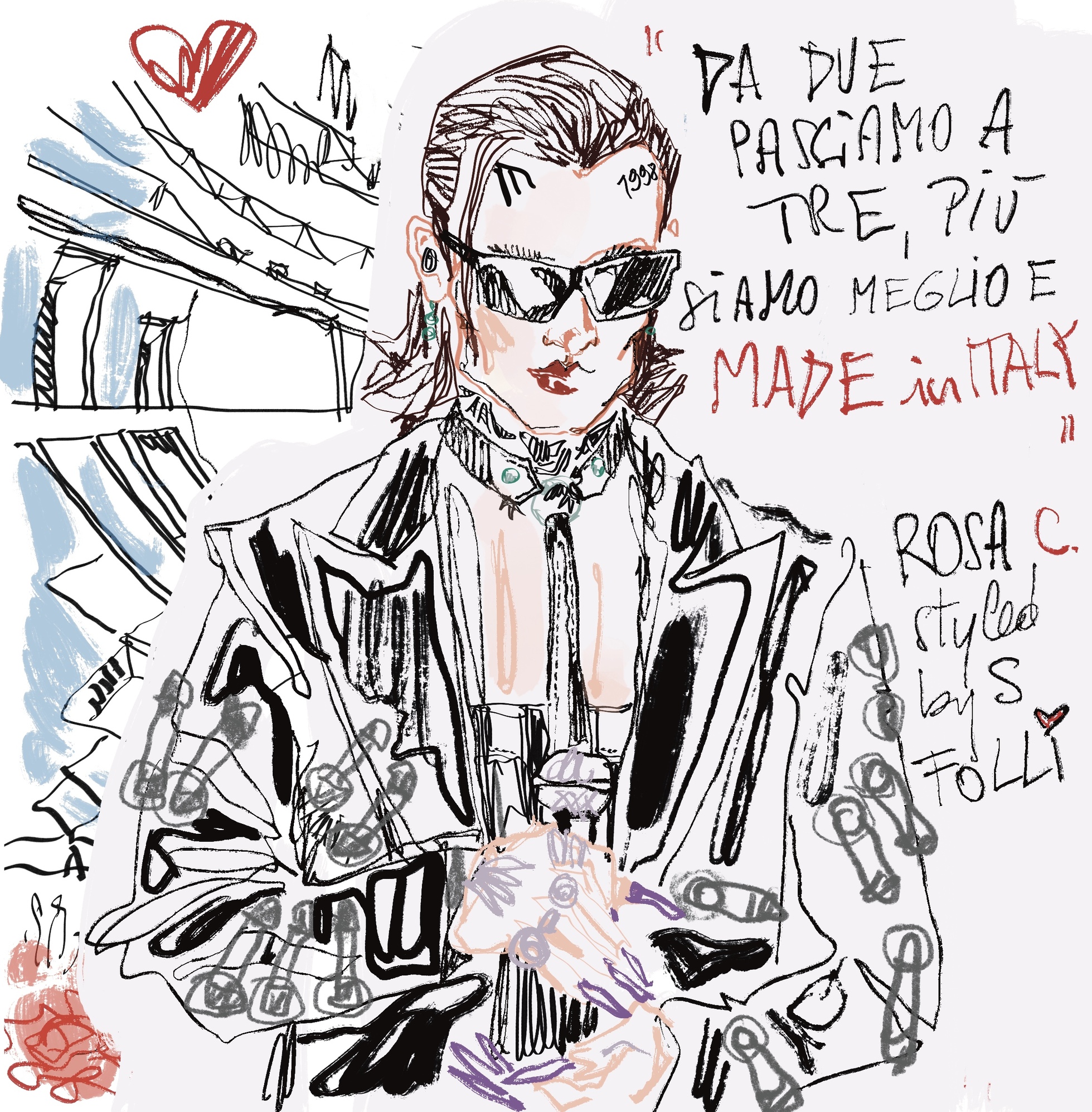 Una serie di artwork di Ascari illustrano una selezione di look tra i più significativi: da Marco Mengoni in total leather Versace (con ispirazione dall’archivio anni Novanta) e styling di Lorenzo Posocco, che ha curato anche il look di Elodie, avvolta in una voluminosa eco-fur Valentino Haute Couture. Mr. Rain in gessato décontracté GCDS (accessoriati da preziosi della collezione Belle Epoque di Damiani) e Madame con un ensemble nei toni del blu elettrico di Off-White, un percorso estetico che segue il concept della canzone, secondo lo styling di Simone Furlan.
