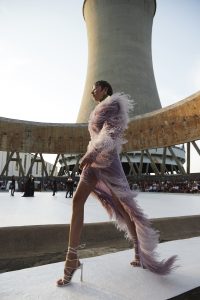 Nella grande arena le modelle cominciano a sfilare al tramonto, mentre il sole scivola sulle torri di raffreddamento, generando un’atmosfera metafisica.
