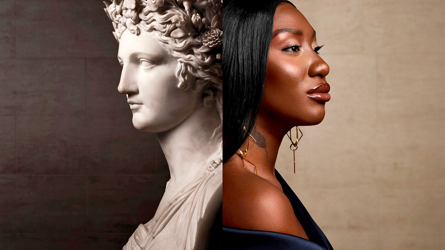 Vestita di nero, Zendaya completa la Vittoria Alata di Samotracia, in marmo pario, esposta in cima alla scalinata centrale del Louvre dal 1884 ma riscoperta, dopo secoli in cui se ne erano perse le tracce, nel 1867, in stato frammentario, da Charles Champoiseau, viceconsole francese a Edirne. L’opera fu scolpita a Rodi in epoca ellenistica per celebrare una vittoria in battaglia e l’autore è sconosciuto. La Venere di Milo, un’altra scultura greca ellenistica frammentaria, in questo caso priva delle braccia, è invece reincarnata da He Cong. Risalente al 130 a.C. circa, la Venere è considerata tra gli esempi di rappresentazione della bellezza femminile più significativi (non per l’artista Pierre-Auguste Renoir, per il quale era solo «Un gran gendarme», con i suoi più di 2 metri di altezza).