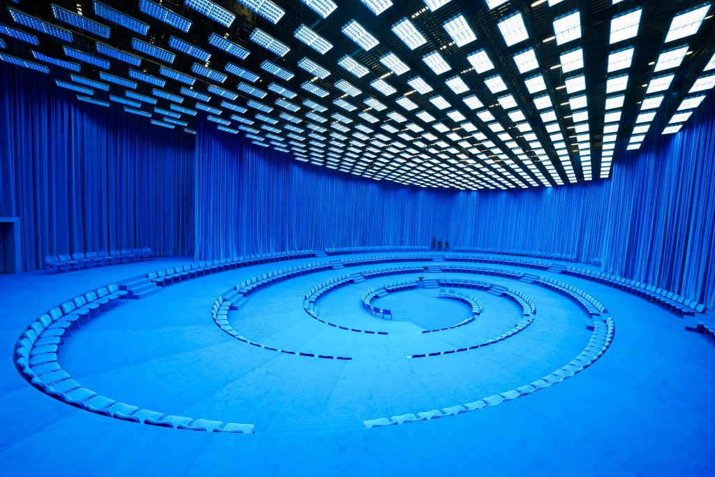 La terza sala vede il passaggio al nuovo millennio e la relativa coincidenza con una spettacolarizzazione senza precedenti, sostenuta da budget sempre più elevati e da una forte integrazione con l’architettura e il design. Le grandi scenografie costruite per le sfilate diventano ambienti totali, capaci di trasformare lo spazio in racconto immersivo, come nel caso di Karl Lagerfeld, con Chanel al Grand Palais di Parigi. Parallelamente, alcuni designer scelgono la strada opposta, lavorando per sottrazione o spostando le sfilate in luoghi marginali, producendo eventi che lasciano tracce materiali e simboliche più che immagini patinate. Iconico Alexander McQueen che fa spruzzare un abito in diretta a due robot industriali.