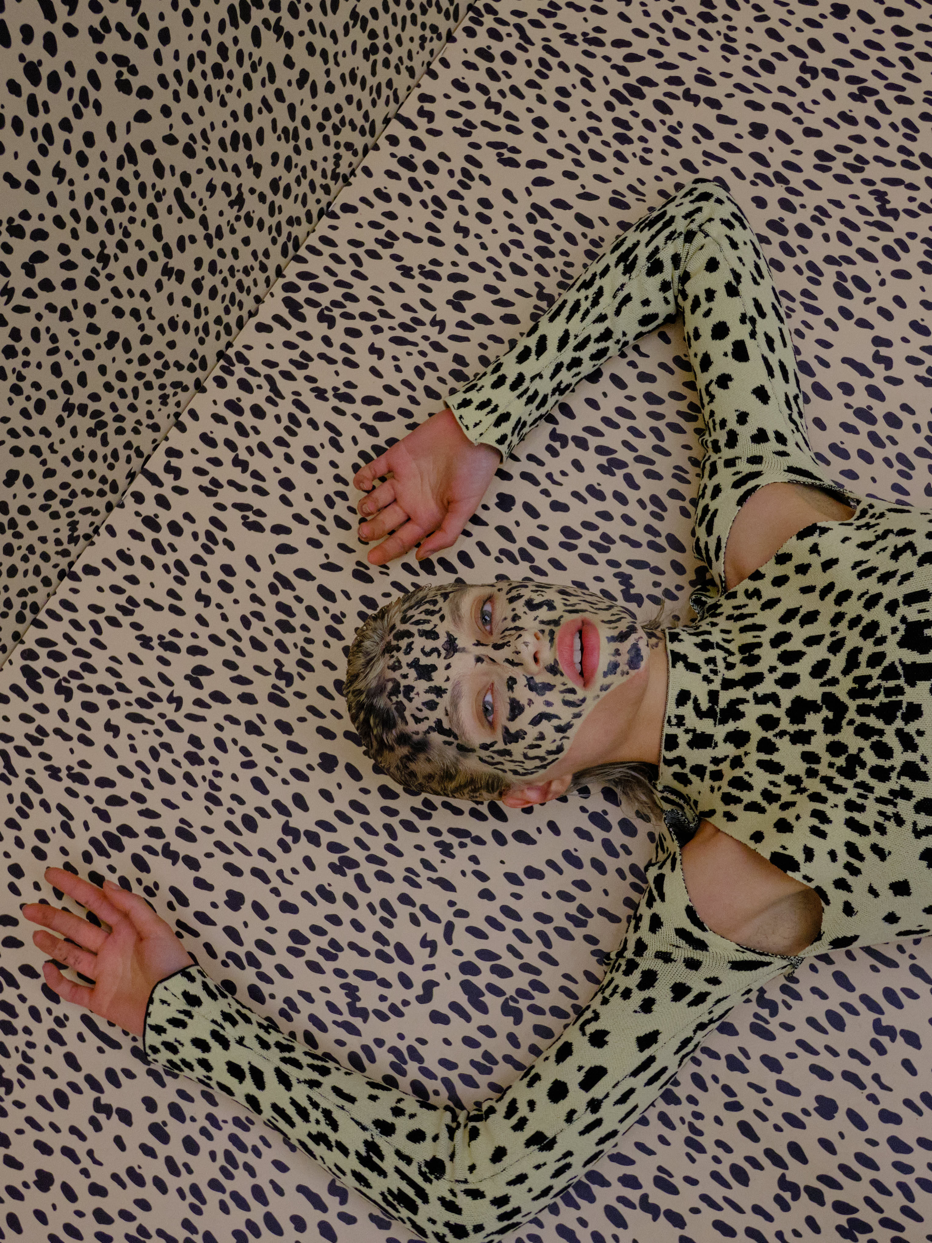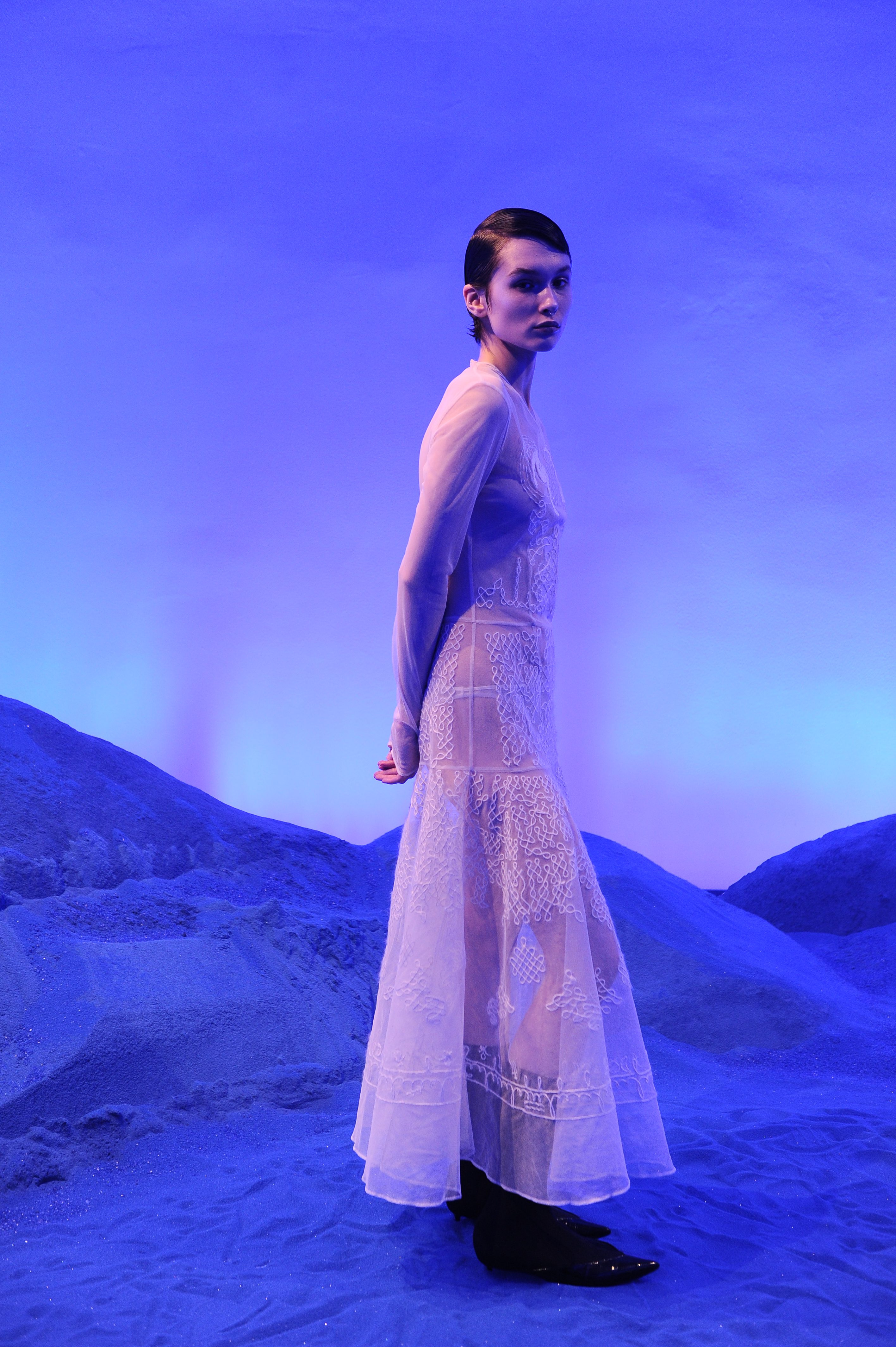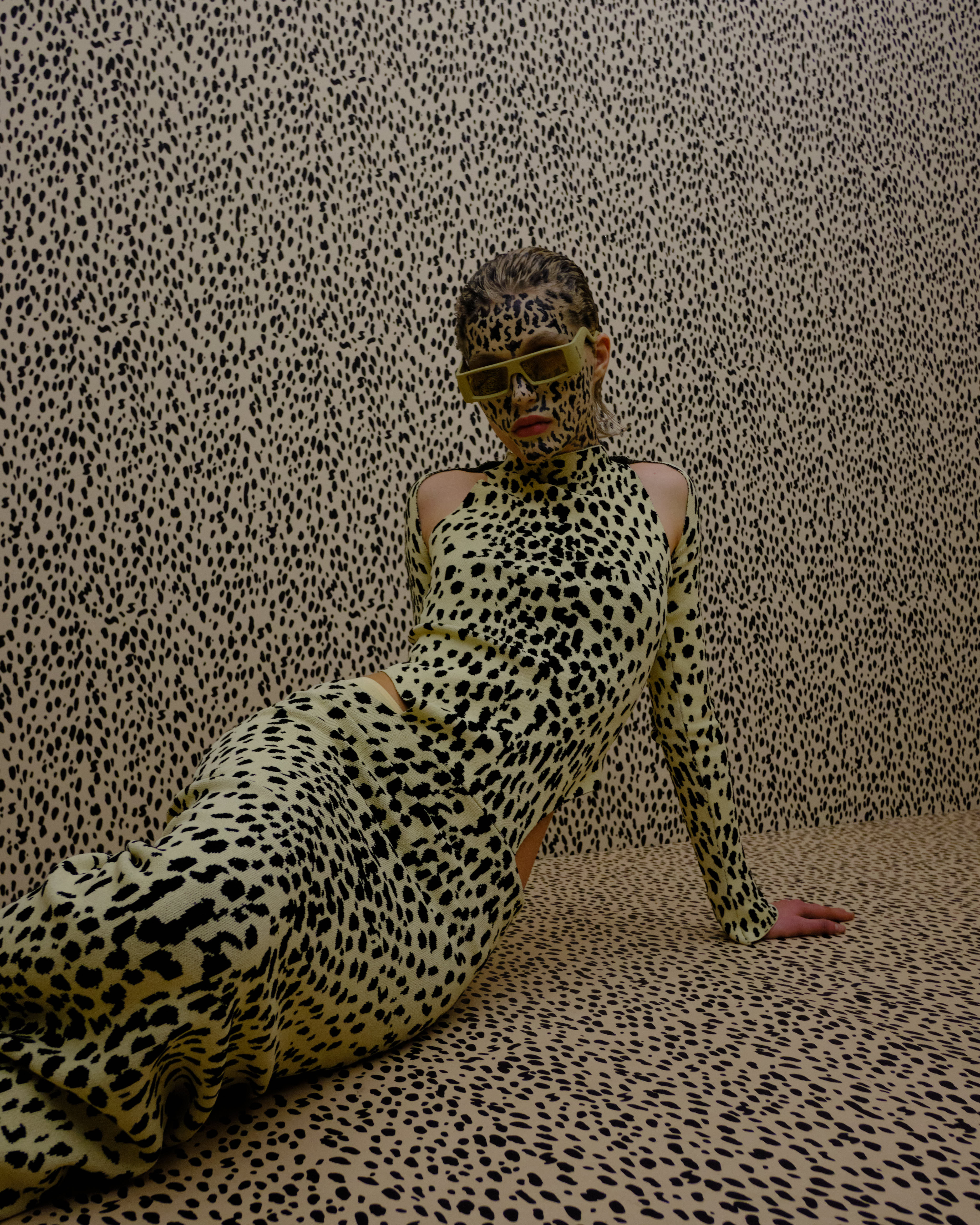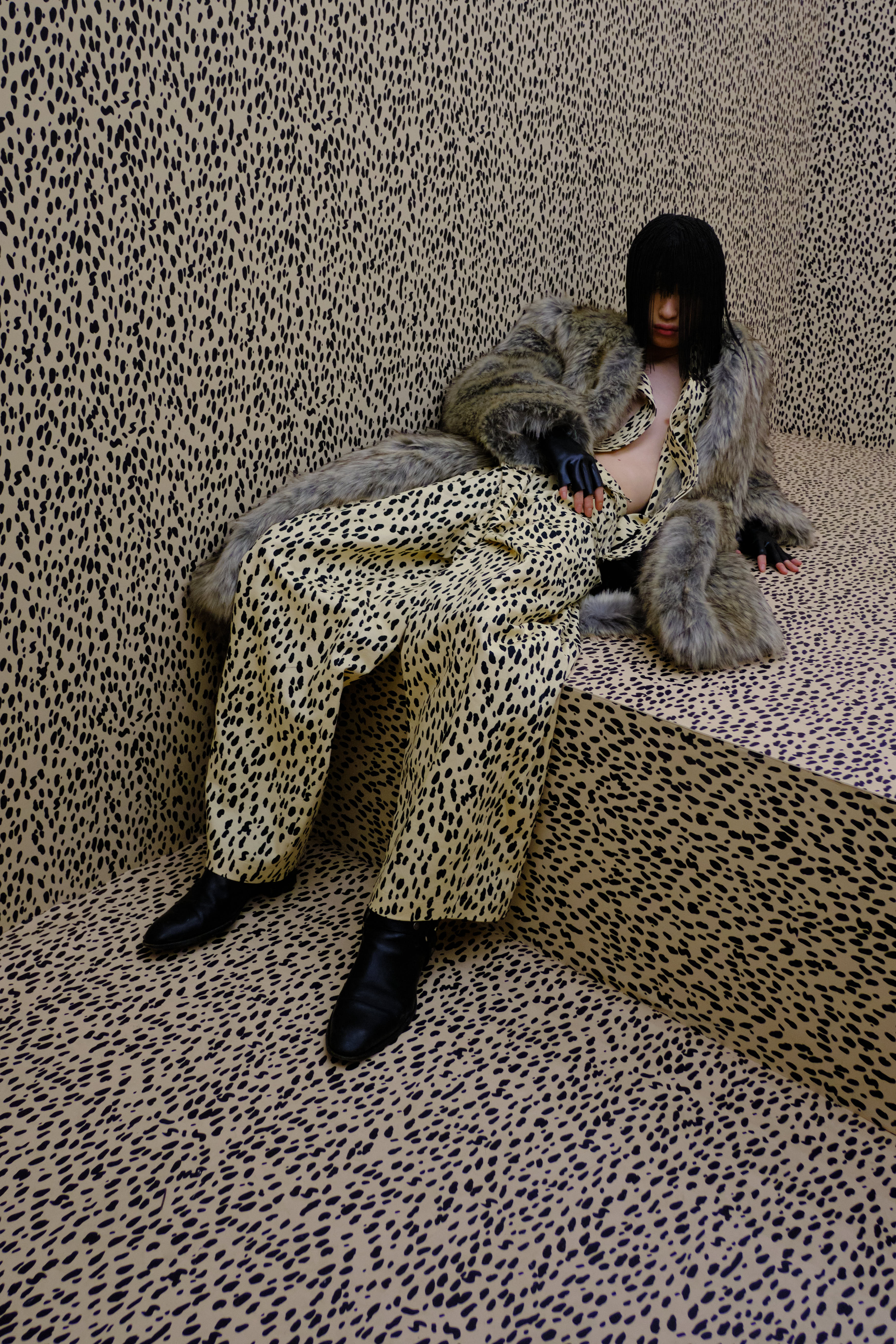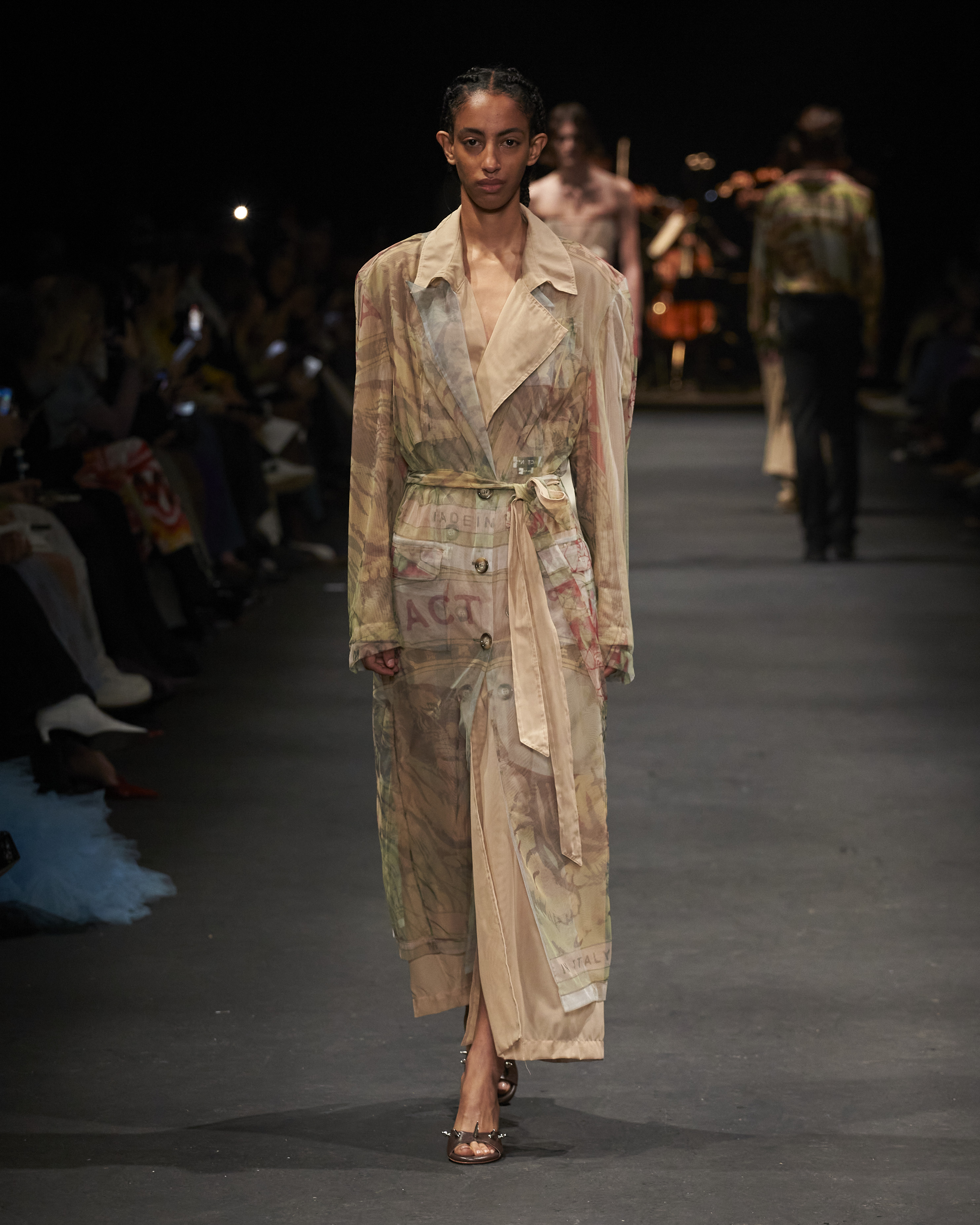 Brand italiano indipendente fondato da Sabrina Mandelli che gioca sui contrasti e su modalità di presentazioni sempre ironiche e iconoclastiche. Per questa collezione dal titolo “I can’t sleep again“, la designer gioca sul binomio capi che rivelano/che nascondono, prendendo ispirazione dal film “La donna invisibile” (1983). Una bipolarità che si manifesta da un lato tramite i colori marroni e grigi che si mimetizzano con gli ambienti urbani, dall’altro l’arancione brillante e il blu elettrico. Uno scenario a tratti surreale in cui compaiono il leopardo e la iena.Forse sono le briciole del percorso di Hansel e Gretel? O forse sono un inno alle origini punk del nome Ssheena?