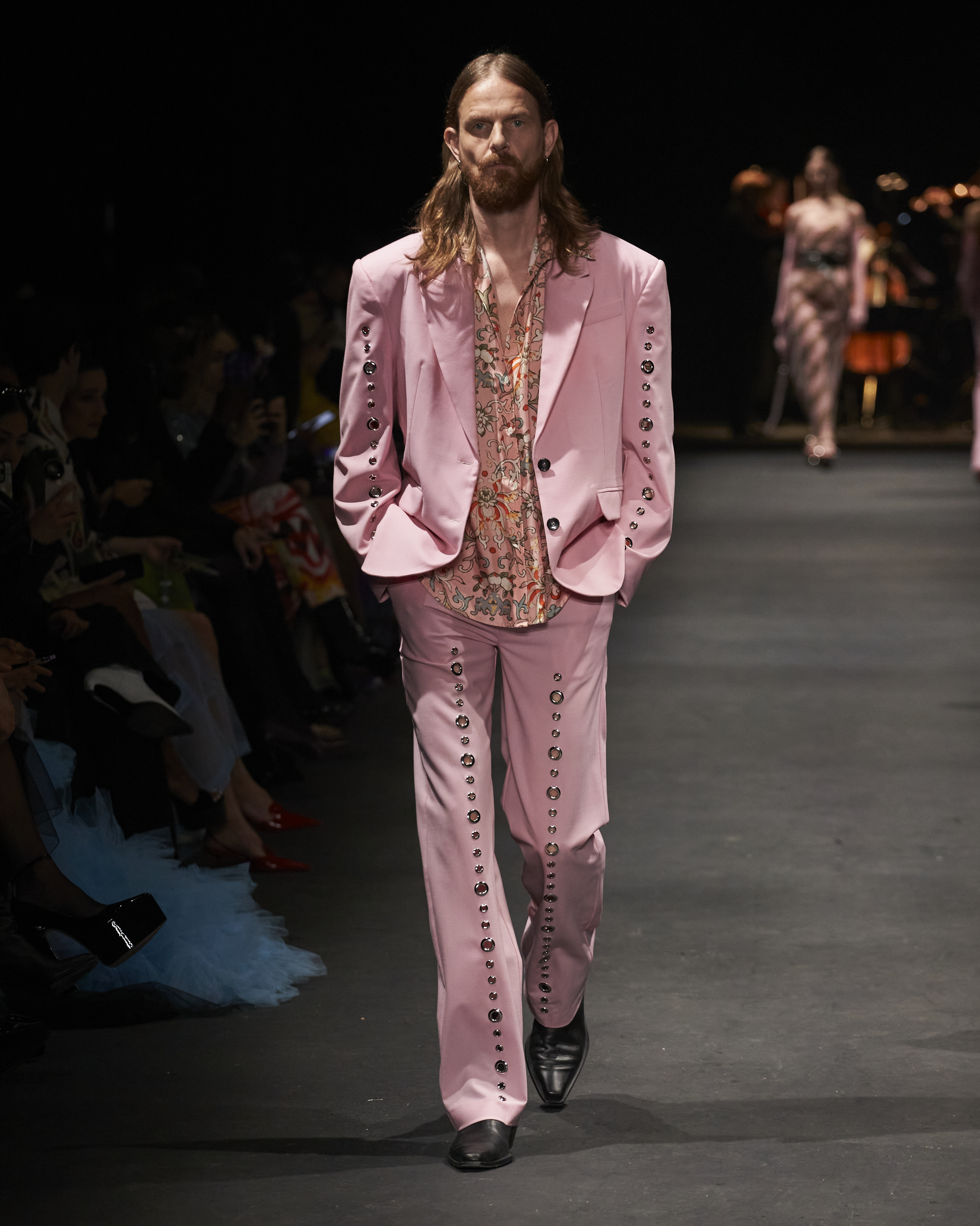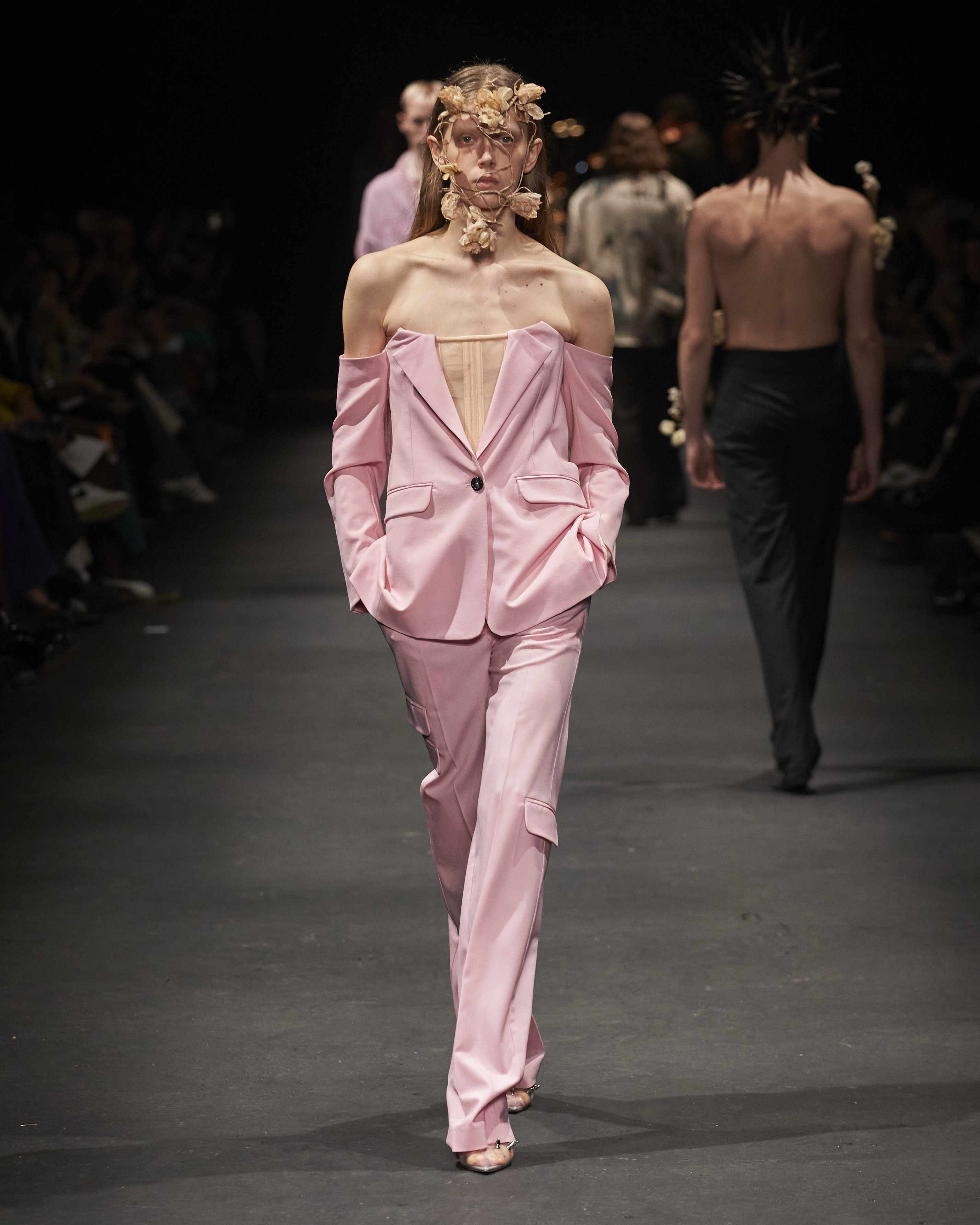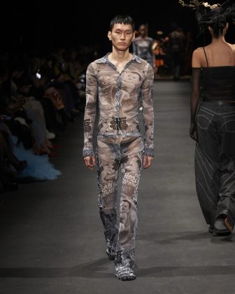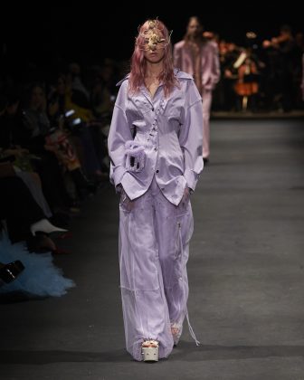 Uno dei brand più sperimentali on show a Milano, fondato da Luca Lin e Galib Gassanoff ha deciso recentemente di separarsi: Lin resta alla guida del marchio sia dal punto di vista creativo che strategico, mentre Gassanoff ha deciso di iniziare una carriera nell’arte e nella moda. Sin dagli esordi ACT N°1 ha lavorato su uno stile incentrato su arte, artigianato e multiculturalità. Il nome ha un significato preciso che si riferisce al primo atto della vita che ha ispirato i designer nello sviluppo del marchio, con un’attenzione particolare al background personale, alla loro infanzia e al loro patrimonio culturale. Ogni stagione la collezione si propone di raccontare una storia di inclusione e di condizione femminile in tutto il mondo. Con questa nuova collezione il tema gioca sul senso del danno e su come la natura trova il modo di guarire un sistema ferito. ACT N°1 esplora questa esperienza attraverso la collaborazione con Ara Lumiere con cui è stata creata una capsule di camicie e pantaloni di seta genderless con le stampe signature di ACT N°1 – che raffigurano acquerelli e decorazioni calligrafiche tradizionali cinesi. Una una percentuale dei ricavi sarà devoluta ad un progetto comune di sostegno alle donne ferite dagli attacchi con l’acido. Il cuore della collezione è costituito da camicie e abiti in seta stampata, che definiscono una silhouette ampia. I caratteristici volant in tulle del marchio sono abbinati a giacche formali e smoking per esaltare il lato flamboyant del marchio. Il punto forte di questa stagione è rappresentato dai capi combo che mescolano parte della giacca e del trench con piccoli corsetti, lavorando sul concetto di nascondere e svelare il corpo. Ha commentato Luca Lin: “Fin dalla prima sfilata, una delle principali preoccupazioni di ACT N°1 è stata quella di sostenere le donne di tutto il mondo che lottano contro condizioni ingiuste e violenza. Questa volta l’esigenza di essere più efficaci e pratici ha acceso la collaborazione con Ara Lumiere e siamo orgogliosi di collaborare per difendere e sostenere le donne colpite da attacchi con l’acido. Condividiamo gli stessi valori e siamo orgogliosi di questo progetto comune.”