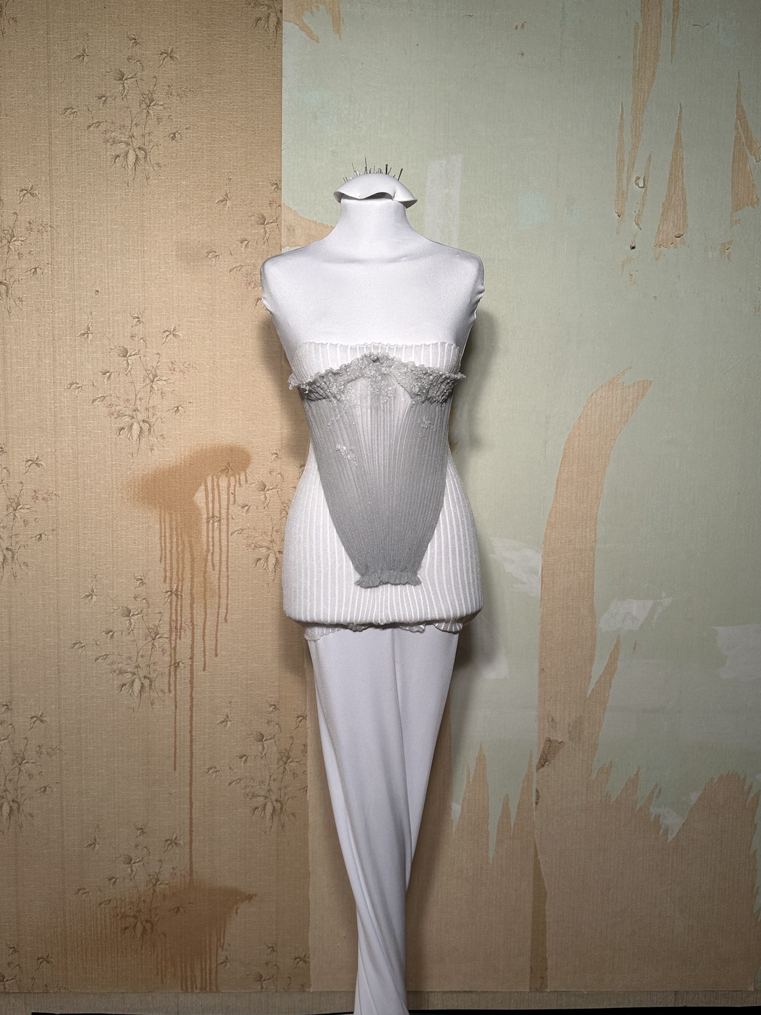 Fondato nel 2022 da Giulia Bortoli, consulente di maglieria, Spaccio è un laboratorio di maglieria contemporanea composto da un team di giovani menti creative, che unisce sperimentazione tessile all’alta artigianalità. In quanto spazio fisico basato nel cuore di Milano e legato alla cura dei dettagli e alla scansione del tempo, riflette e dà visibilità ad una generazione che ha bisogno di ritrovarsi in un percorso di lentezza legato alla materia, che vede nel “fatto a mano” il futuro della maglieria e del suo commercio. Il focus del progetto è proprio l’elevazione della maglieria artigianale declinata in un concetto di “Alta Maglieria” e un linguaggio contemporaneo. Per questo durante la fashion week Spaccio Maglieria ha aperto al pubblico le porte del suo Atelier in zona Milano Centrale con il progetto intitolato “EGO” e una performance di cristallizzazione su maglia in collaborazione con Mathilde Possoz. EGO è una performance di sei giorni, uno studio aperto al pubblico che racconta il legame fra tempo e materia, manipolato e sottomesso al mondo contemporaneo. Durante la performance sono stati esposti cinque capi di alta maglieria “in progress”, ovvero in fase di realizzazione, con l’intento di condividere il processo creativo, la realizzazione e l’estrema cura che l’arte della maglieria richiede. I capi presentati per l’occasione sono il frutto di una collaborazione con l’artista francese Mathilde Possoz, anch’essa focalizzata sul tempo e la sua manipolazione, attraverso processi di cristallizzazione di salgemma.