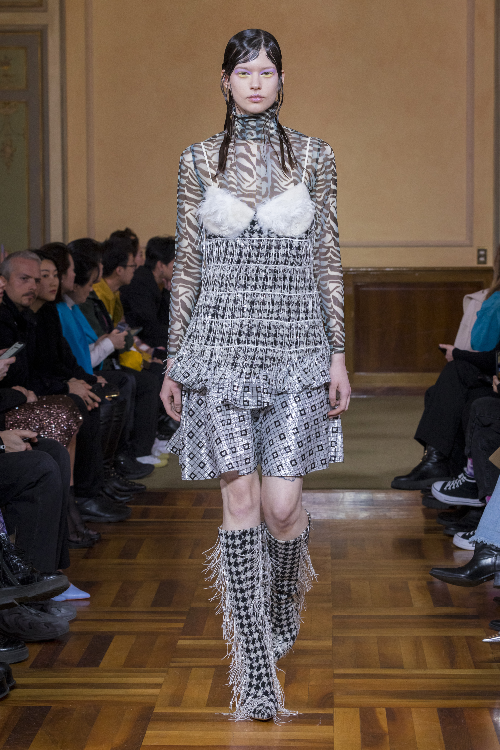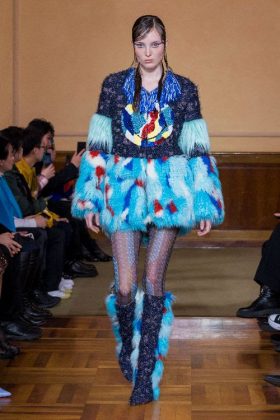 Un’esplosione di colori caldi e freddi per Shuting Qiu, laureata presso la Royal Academy di Anversa, che già vanta importanti riconoscimenti come il Bof China Prize 2019, oltre ad essere stata semi finalista del LVHM Prize 2021. Dopo essere stata invitata dalla Camera Nazionale della Moda Italiana nel settembre 2019 e nel settembre 2022, ritorna per la terza volta sulle passerelle milanesi presentando la sua collezione donna che rende omaggio all’astrattismo francese attraverso l’opera “Compliments” di Frantisek Kupka. La ricerca della designer è da sempre collegata al mondo dell’arte e letteratura, creando legami tra sogno, fantasia e realtà. Così Shuting Qiu sperimenta nuovi legami tra pittura e capi d’abbigliamento, con l’obiettivo di comunicarne una femminilità stravagante e resiliente. Motivi floreali sbocciano in vivaci dinamismi tra forme geometriche e linee decise, mentre faccine sorridenti atterrano liberamente su abiti e accessori. Audaci collisioni di toni, cuciture di jacquard e tweed, pellicce ecologiche in rosa, giallo e blu, impreziosite da perline che completano i look. La collezione presenta dei capi lingerie in collaborazione con il marchio Triumph, dal carattere romantico con ricami frizzanti e accattivanti. I ricordi prendono metaforicamente vita attraverso l’utilizzo di tessuti delle precedenti collezioni combinati con materiali sostenibili, che definiscono l’intera collezione. Un messaggio di attenzione verso l’ambiente in una chiave spensierata, puerile e ironica, tra colori vivaci e grintose sovrapposizioni di strati.