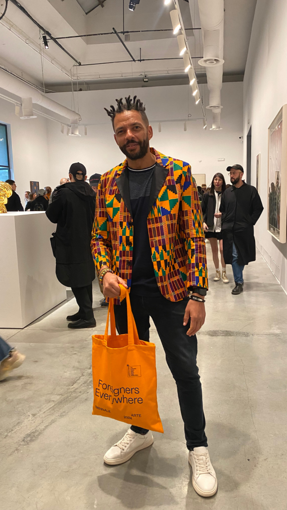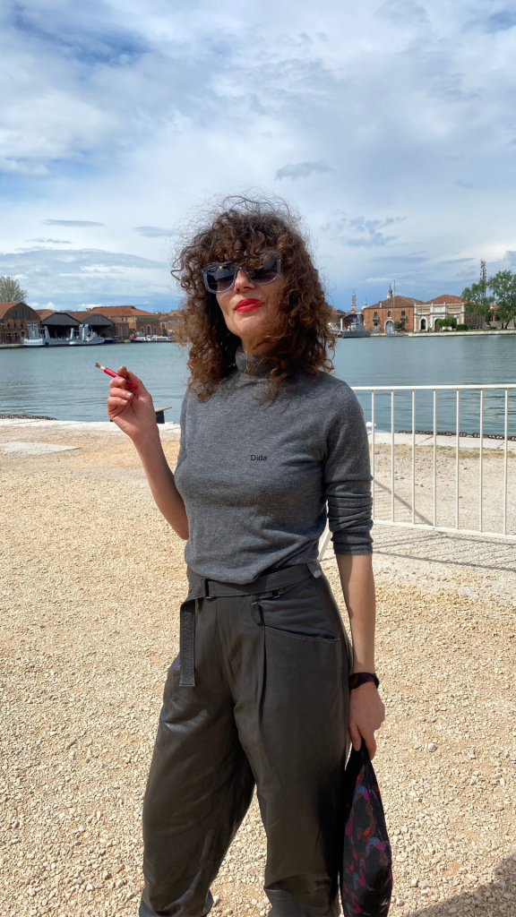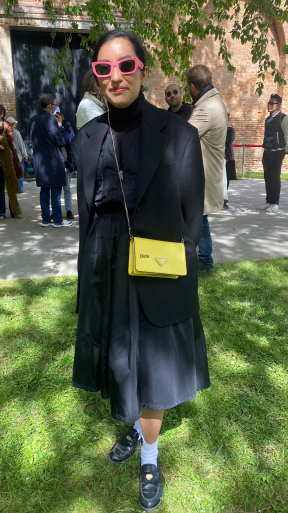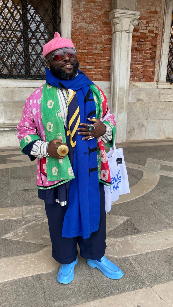 Le ultime settimane sono state decisamente impegnative. Ci siamo lasciati alle spalle, – ma ci abbiamo anche lasciato le spalle a forza di portare shoppers loggate con libri e cataloghi dentro, – miart, Il Salone del Mobile, il Fuorisalone, la Design Week e la Biennale di Venezia. Una maratona, la Milano – Venezia, adatta solo ai più caparbi Long jogger di grado intenso terminata con una alzata di bandiera bianca alla soglia del Padiglione Italia di Massimo Bartolini. Nella sfrenata corsa tra Giardini, Arsenale e palazzi storici vari che ospitavano i Padiglioni Nazionali, qualche chicca a destra e a manca non ce la siamo certo fatta mancare; a mio personale parere il progetto “kith and kin” di archie moore a rappresentare l’Australia o quello del collettivo Open Group con “Repeat After Me” per la Polonia, si sono meritati un tutt’altro che un silenzioso “WOW”. Ma non intendo parlare ancora d’arte, dopo che illustri e temerari colleghi e colleghe si sono prodigati a scrivere decine e decine di articoli su ciò che è successo nelle settimane passate. Piuttosto, voglio porre la mia attenzione su quanto la gente dell’arte sia assolutamente la più glamour del pianeta. Un glamour che non ha nulla a che vedere con abiti firmati o borse limited edition, ma che riguarda lo stile e la personalità che parlano tanto di cultura, costumi, usi e carattere. Allora, saltellando e cercando di vedere il più possibile alla Biennale “Stranieri Ovunque”, tra un battello e una calletta, tra un bacaro e una panchina, la mia attenzione è caduta sugli abbigliamenti variopinti, disinibiti e assolutamente eccezionali incontrati in questi giorni folli. Tra artisti, curatori, influencer, collezionisti, designer o semplici visitatori ecco una carrellata senza stilare classifiche dei più audaci e sinceri look di questa sessantesima Biennale di Venezia.
