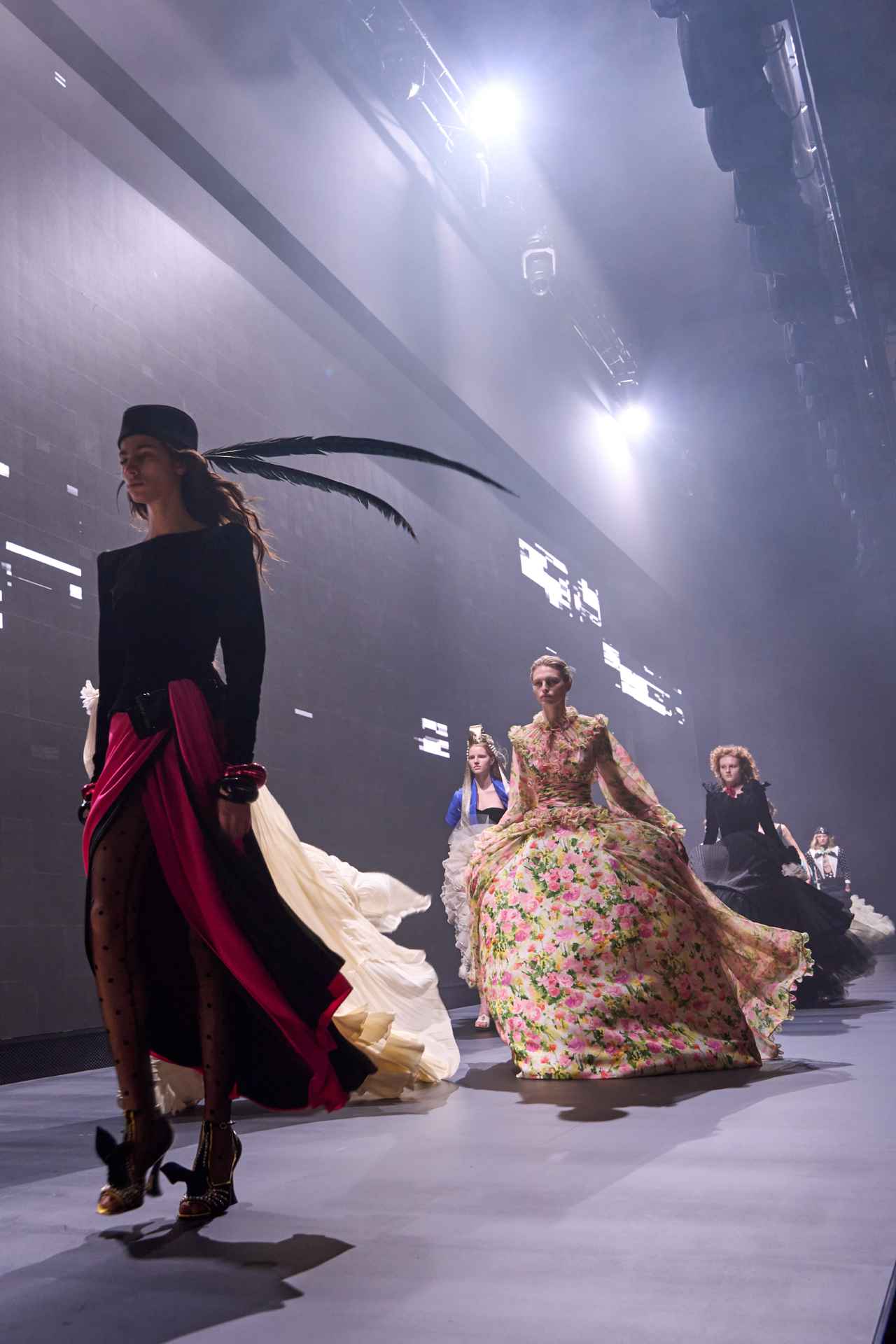 Un debutto in equilibrio tra devozione e sensualità in cui si alternano giacche devotamente severe per completare gonne a matita che precedono abiti corti a balze di tulle con pietre nere incastonate, bluse con balze in pizzo bianco trasparente, velette e mantelli in tulle.