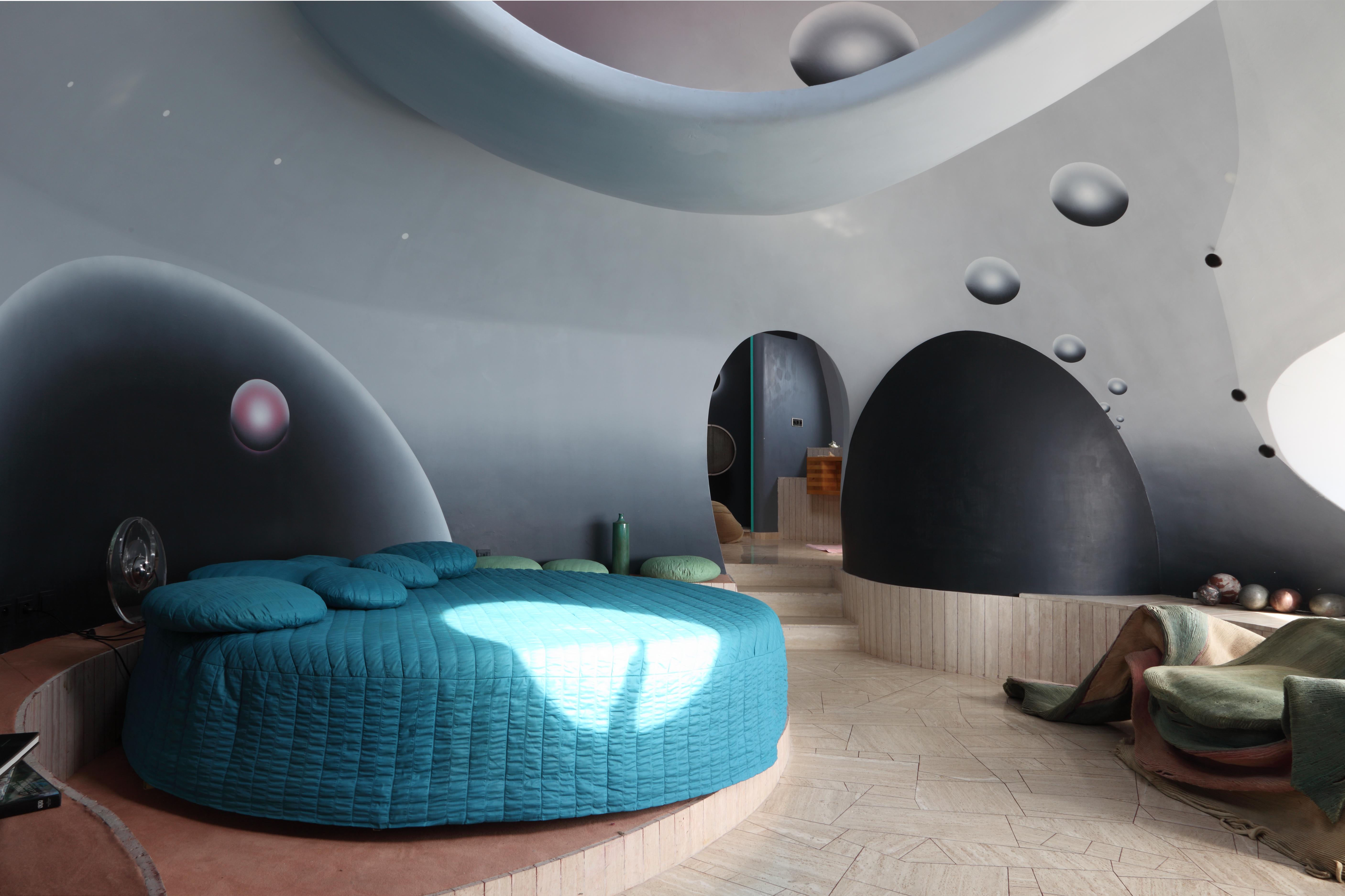 Questa casa-scultura di 1.200 metri quadrati si affaccia sulla baia di Cannes. Capolavoro dell’architettura organica, è organizzata da moduli a forma di bolla, che si contrappongono, anche in termini formali, allo schematismo linearista degli investimenti immobilari su ampia scala del periodo. Al contrario, l’architettura utopica e libera dalle convenzioni della Bubble House (non dimentichiamo che pure Pierre Cardin disegnò un famoso Bubble Dress nel 1954) pone l’individuo al centro della progettazione degli spazi. Si fonda su un concetto di casa concepita come struttura a moduli, che prendono forma dai bisogni dell’essere umano – di cui rappresentano una sorta di involucro grazie alla tecnica del voile de béton armé sans coffrage – e sono assemblabili in composizioni che si adattano alla conformazione del sito. Una sorta di ritorno alle origini, alle abitazioni ancestrali come le grotte, in cui il design curvilineo esprime bellezza, armonia e flessibilità, oltre al dinamismo incessante dell’immaginazione. La creatività fluisce e in effetti l’acqua è l’elemento naturale che ricorre ovunque a Palais Bulles: nella cascata del patio, nella piscina a sfioro, nelle onde del mare all’orizzonte, così come nelle finestre emisferiche che sembrano quasi gli oblò del Nautilus di Jules Verne.