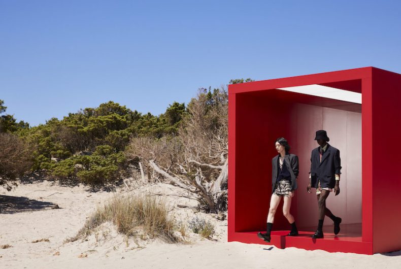 La Spring 2022 Menswear di Prada comunica un senso di utopia, idealismo, speranza e positività. Secondo le parole di Raf Simons e Miuccia Prada, essa rappresenta la libertà di connettersi con la natura e di trascorrere del tempo in spiaggia, una manifestazione di un bisogno primordiale, sia intellettuale che istintivo. Presentata via film a causa delle restrizioni per la pandemia da Coronavirus, la sfilata inizia con i modelli che attraversano un sinuoso tunnel rosso, a simboleggiare il passaggio verso il mondo esterno tanto agognato in quel periodo. Quando i modelli lo raggiungono, scopriamo trattarsi di una spiaggia. Per la precisione siamo sulla costa di Capo Carbonara, nella parte sud-orientale della Sardegna, un’area affascinante caratterizzata da paesaggi mozzafiato, con scogliere maestose e acque cristalline in cui l’azienda sta sostenendo il ripristino degli ecosistemi marini. L’obiettivo del film è di evocare “quella gioia, simile al ricordo di un bambino che va in spiaggia. È il piacere più semplice e sincero, che nella sua semplicità diventa anche qualcosa di profondo e senza tempo” aveva spiegato Simons nelle note pre-show.