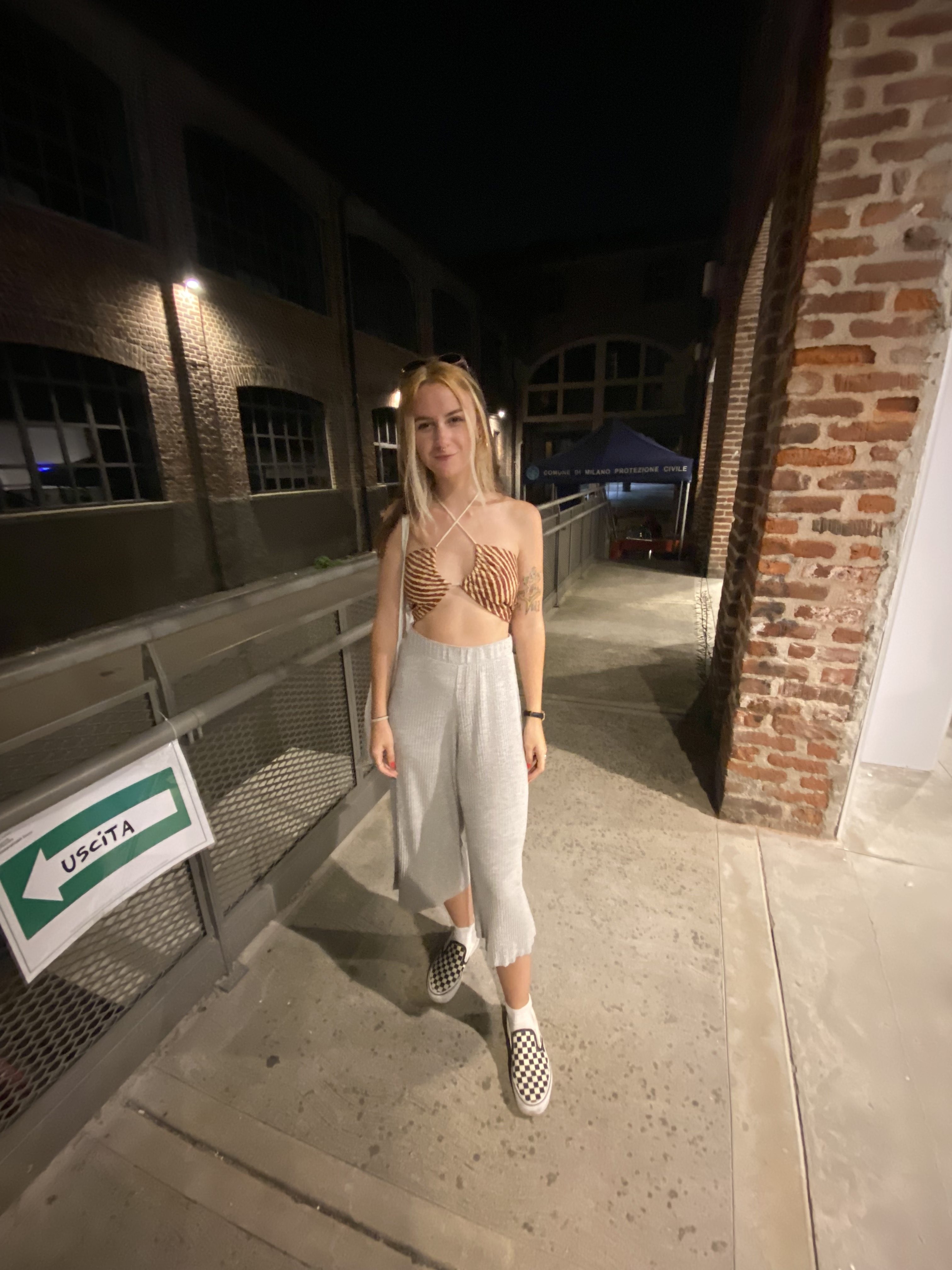 «Il top lo ha fatto una mia amica. Adoro portare dei disegni diversi, fuori dal comune. Per il resto ho scelto un look molto comodo».