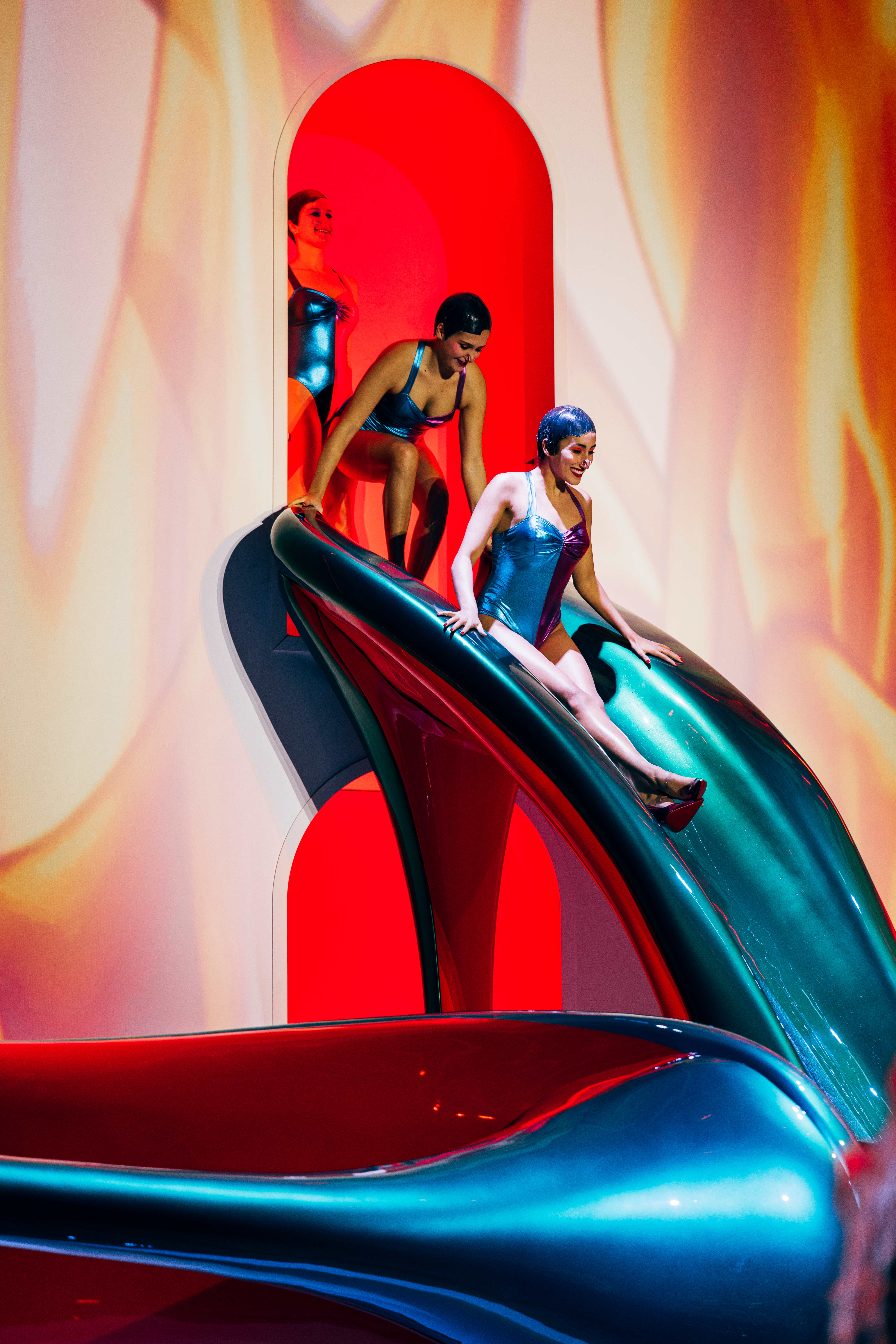 Christian Louboutin è da sempre affascinato dalla danza e dal mondo acquatico: lo show dal titolo Paris is Louboutining ha voluto unire queste passioni in uno spettacolo di grande impatto, scegliendo per l’occasione uno dei principali monumenti Art Déco di Parigi, progettato da Lucien Pollet nel 1929. Per dare vita alla sua visione ha naturalmente dato carta bianca a David LaChapelle, noto per il suo uso surrealistico dei colori e dell’acqua, e a Blanca Li, il cui lavoro fonde l’eleganza della danza con la forza delle prestazioni atletiche. Il risultato è stato uno spettacolo surreale che ha immerso gli ospiti nell’atmosfera dei balletti acquatici hollywoodiani degli anni Cinquanta, interpretati in una prospettiva dai toni pop.