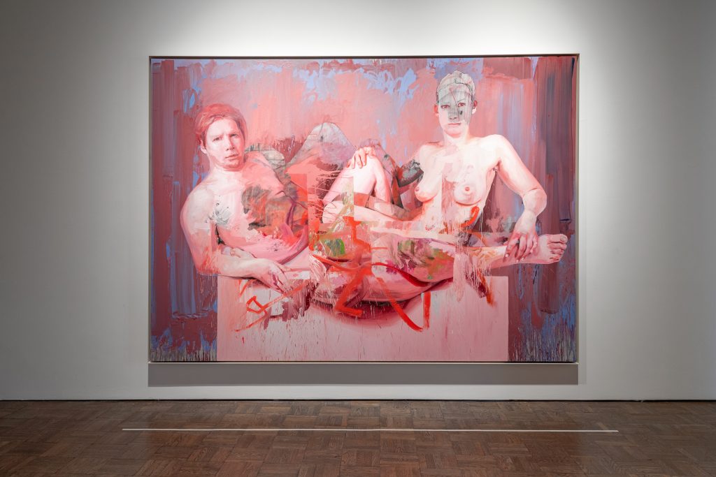 In Ruben’s Flap, Saville tematizza la monumentalità delle figure del maestro fiammingo per mostrare come la visione e percezione di un corpo opulento abbia subito, dal Barocco alla contemporaneità, un cambiamento tanto radicale quanto paradossale. Nell’opera la solennità cede al posto all’intimità: la spontaneità dei volti e la vividezza pulsante della pelle assecondano le inflessioni dello spirito, nel segno di un’umanità autentica e disincantata. Ed è proprio qui che il richiamo al crudo espressionismo di Egon Schiele si fa chiaro: Saville non si limita a mostrare le vulnerabilità della carne denudata ma fa vibrare sotto l’epidermide il disagio e l’inquietudine della livida attualità.
