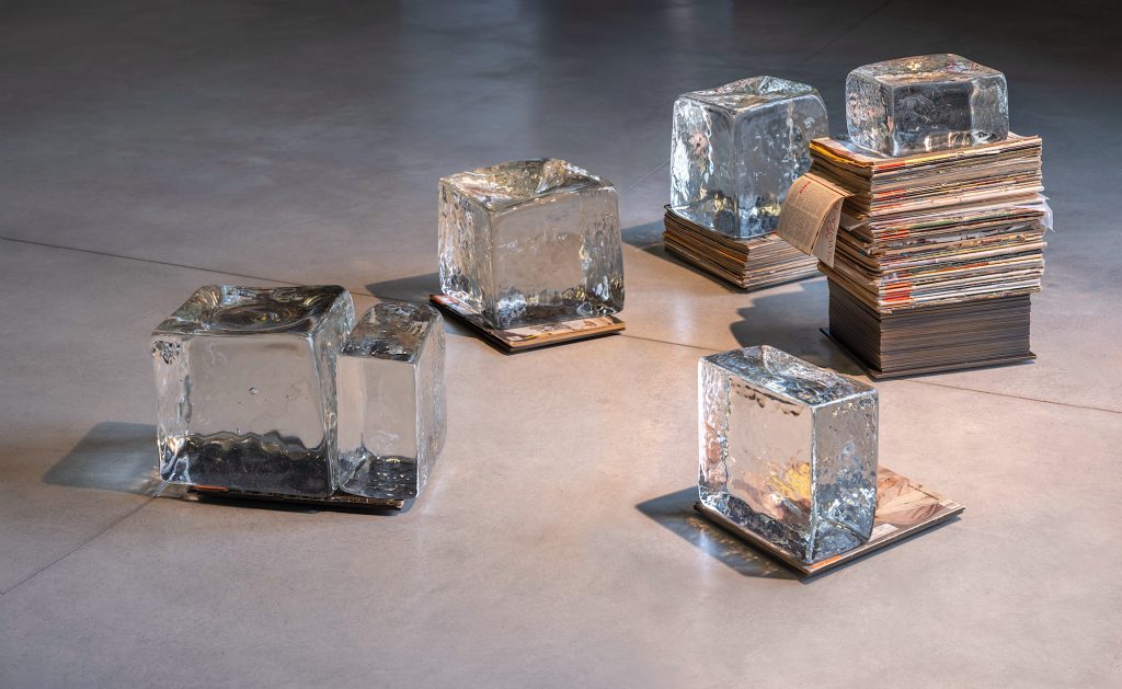 Gran parte delle immagini su cui l’artista lavora provengono dalle riveste Ebony e Jet, radicate nei suoi ricordi d’infanzia e che formano un ricco archivio di simboli e memorie che nutre anche altre delle opere in mostra. È questo il caso di Black Totem: un assemblaggio di numeri d’epoca che danno forma ad una colonna alta e slanciata, un vero e proprio totem laico che rimanda alla memoria collettiva della comunità afroamericana. Versioni più modeste di queste colonne si ritrovano in altre sculture — come 5 Properties, Missing Film e Tried by Fire — dove i magazine si fondono ad altri oggetti, come cubi di vetro e busti scolpiti.