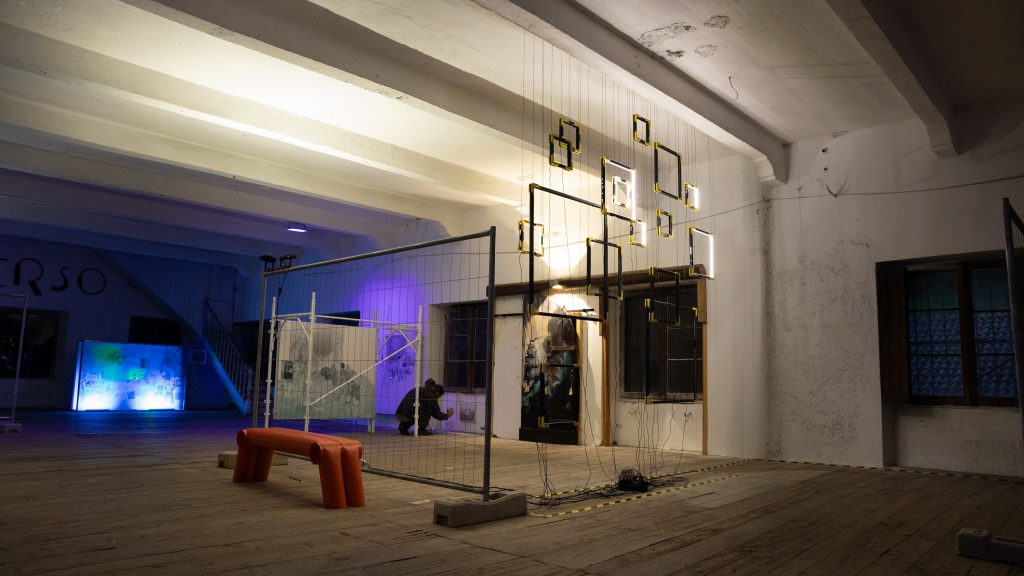 In occasione della mostra 872.903 HZ, il curatore Simone Ceschin promuove un allestimento innovativo dal carattere concettuale e urbano, intrecciando una comunicazione tra le installazioni contemporanee degli artisti ed elementi come reti metalliche e ponteggi, che rievocano l’atmosfera del paesaggio urbano. Gli oggetti di design di Plam Creative Studio, come le panche realizzate con tubi da cantiere, contribuiscono alla suggestiva commistione che caratterizza il percorso espositivo. Questo progetto curatoriale esalta un’esperienza significativa e coinvolgente, dando origine a una mostra fortemente contemporanea, che richiama gli spazi espositivi della Biennale e s’inserisce in un contesto di interazione con l’ambiente da cui scaturisce una percezione fluida e organica.