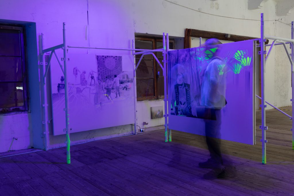 Basandosi su questa teoria, le opere di Edoardo Ongarato sviluppano una pluralità diversificata di media, dalla pittura alla composizione digitale, integrando elementi del mondo urbano e del post-graffitismo. La narrativa dell’artista si serve di visioni e trasformazione per rievocare immagini archiviate nella memoria. Ambienti eterei emergono dalla sovrapposizione di disegni e fotografie, per sospendersi in un’alternanza di assenza e presenza, suggerita dalla luce UV che riflette la vernice fosforescente sulle tele, catalizzando il sincretismo in siti che ospitano spiritualità alternative.