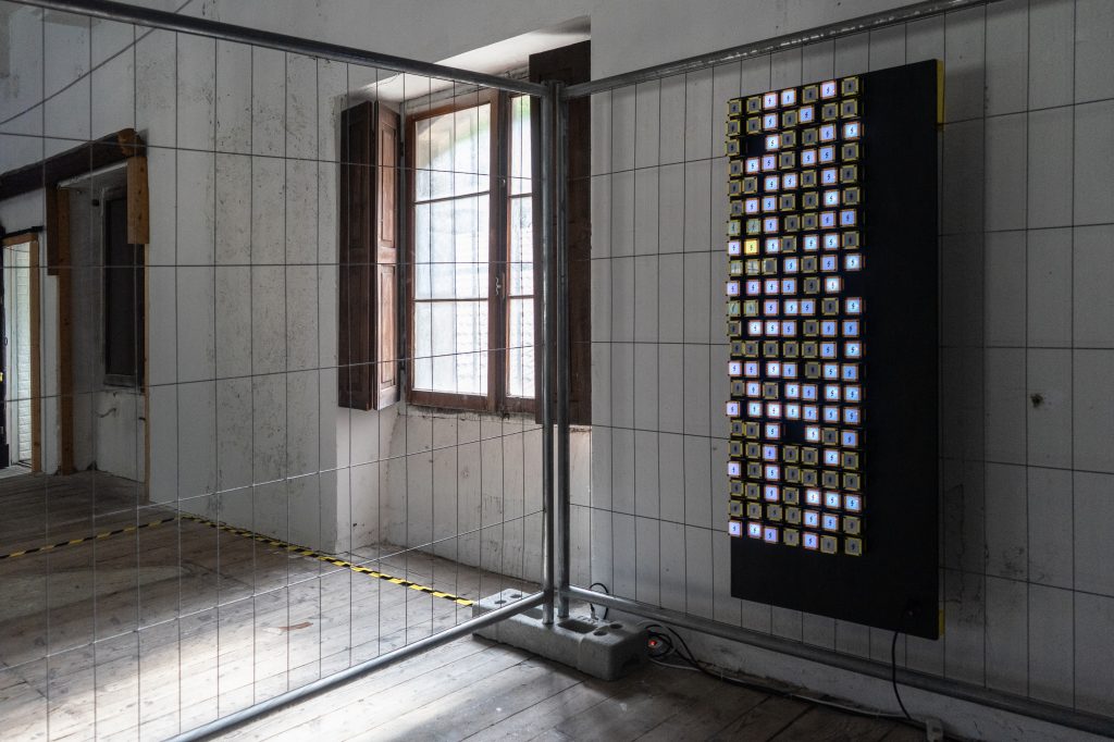 Le installazioni multimediali di Enrico Antonello aprono l’esposizione introducendo la relazione tra luce, suono e movimento, accompagnando circolarmente il visitatore lungo un percorso immersivo. Il concetto di multiplo diventa una costante per l’artista, evidenziando la ripetizione alla base della genesi di ogni oggetto. L’opera inedita Lightning esemplifica questa considerazione, mostrando 144 caselle uguali che riproducono combinazioni diverse. I codici, generati da Arduino, rispecchiano la naturale evoluzione e imprevedibilità delle cose, favorendo l’accessibilità alla modifica e l’interattività tecnologica, nonostante una concezione utopica avvolga le installazioni che sembrano vivere di vita propria.