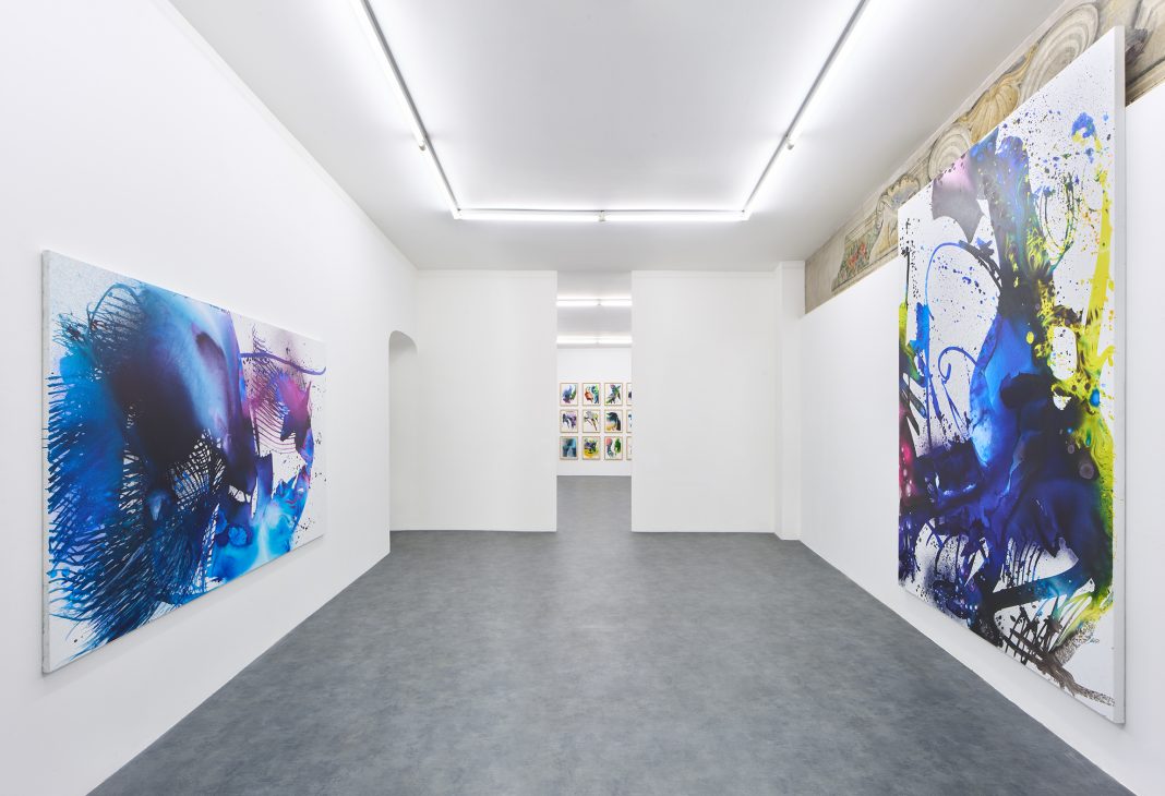 Nella mostra “Mad Max” Frintrop espone una nuova serie di lavori, per lo più di medio-grande formato, insieme a un’edizione di dieci acquerelli inediti, origine del processo di sperimentazione che nasce, appunto, direttamente sulla carta per poi essere trasposto su tela con un’altra tecnica.