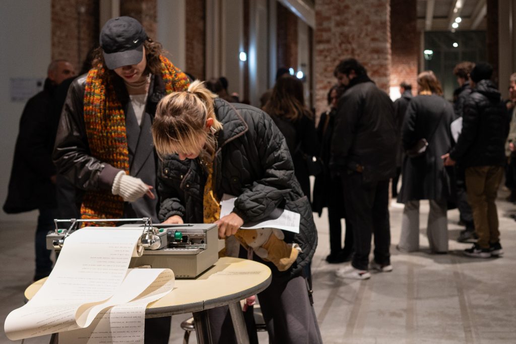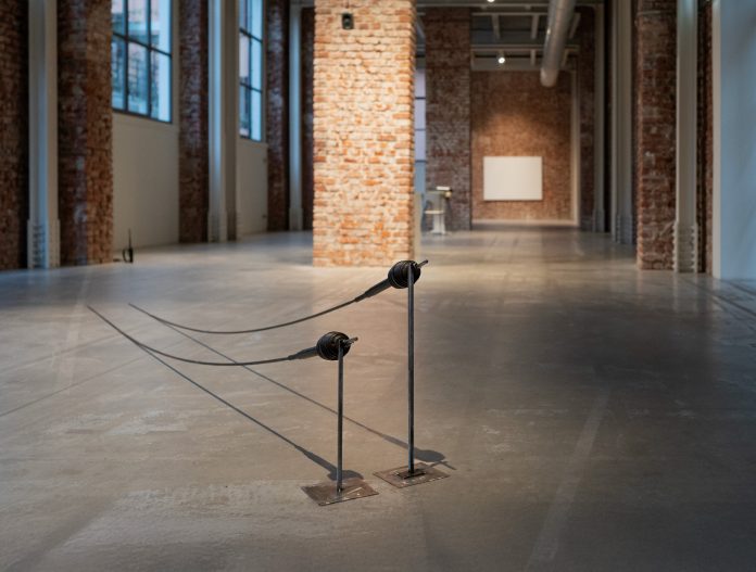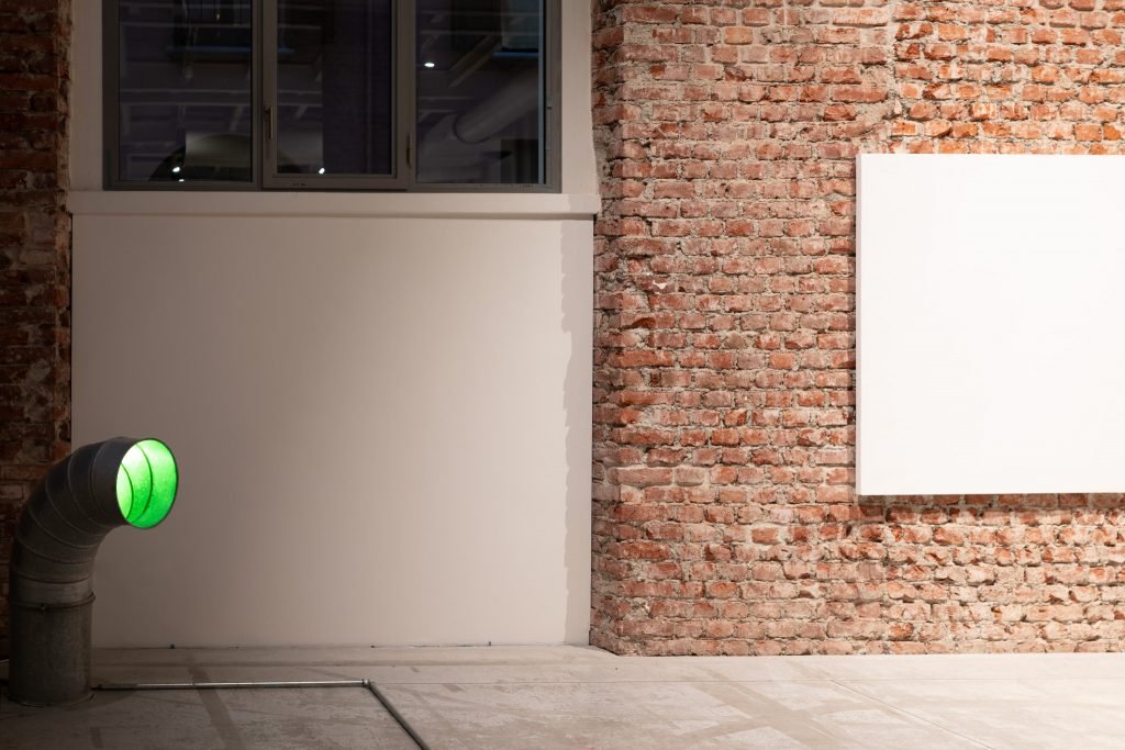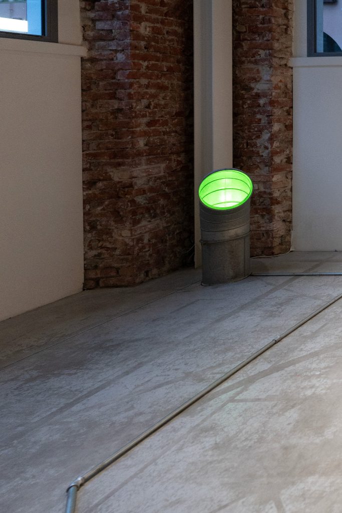 Un altoparlante, posto al centro dello spazio espositivo riproduce in loop una composizione di 30 minuti, creando un’atmosfera senza fine, caratterizzata da echi distanti e malinconici. Roberto Casti, con ARIA (2024 – on going), scandisce con una grafite il tempo e i movimenti spaziali su tela o tessuto; il risultato è un apparente monocromo bianco che svela la complessità dei suoi elementi compositivi solamente da vicino, ricordando un attimo di improvvisa rivelazione, proprio come quando si intravede il pulviscolo danzare in controluce accanto a una finestra. Anche nella serie Aleph (2023 – on going), Casti colleziona tappeti sonori di registrazioni di persone care, messi poi in risonanza tramite oggetti di derivazione comune, come tubi di scarico o condotti per l’areazione.
