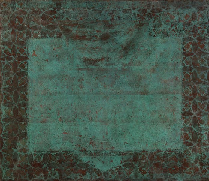 6. Fabio Iemmi. Ornato mistico, 2015-2025, intonaci graffiti, terre naturali, pigmenti minerali su tela e damascati, cm 130x150