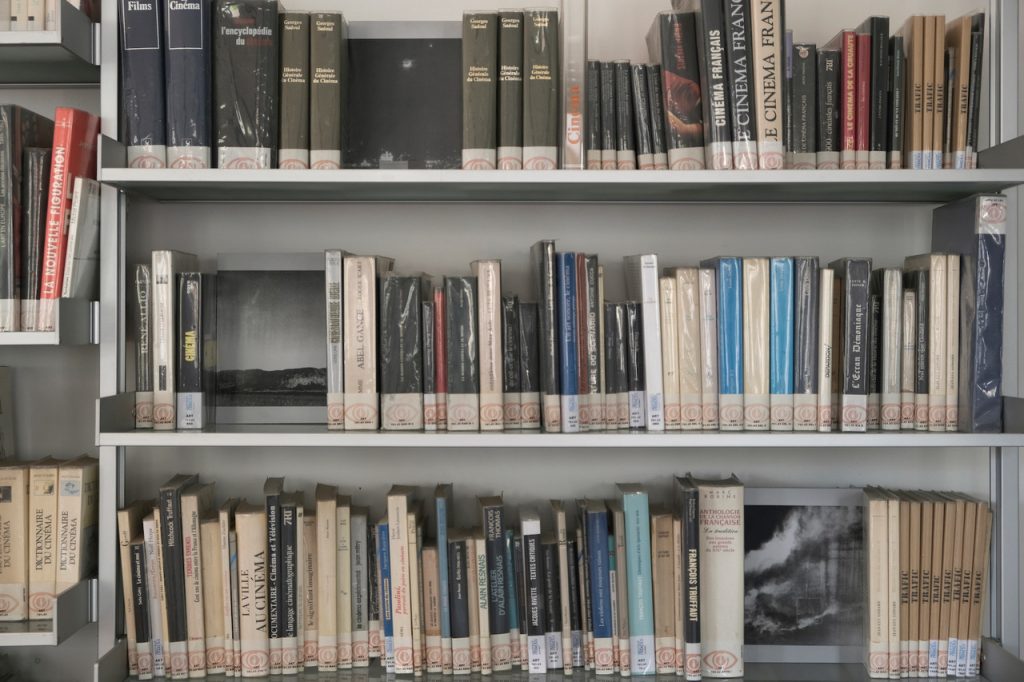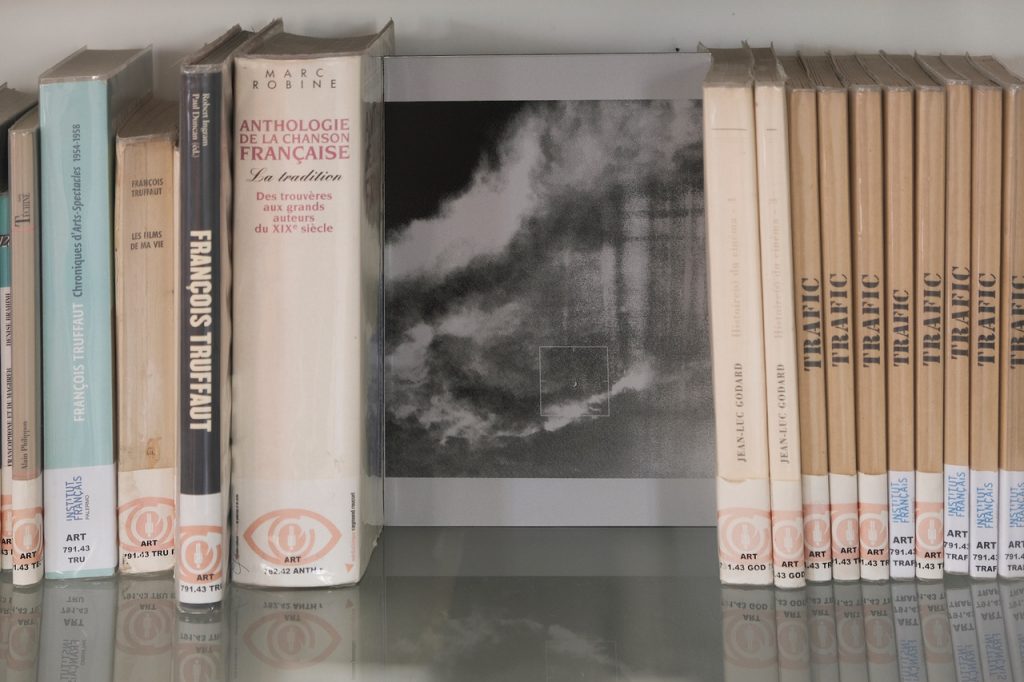 Proprio qui, in un luogo in cui la lingua e la parola fanno da padrone insieme ai suoni e alle emozioni, i due artisti hanno reso visibili le riflessioni e le suggestioni che insieme hanno elaborato dalle letture di Lezioni Americane di Italo Calvino, posizionando nello spazio opere discrete e di assoluta raffinatezza poetica e artistica, che si muovono delicatamente tra la dimensione visibile e dell’invisibile della vita. Ne scaturisce una sensazione pregnante di leggerezza che sfida e sostiene contemporaneamente il peso fisico e contenutistico dei libri e dei film già presenti. Mimetizzate all’interno della sezione cinema dell’Institut Français, le serigrafie di Niccolò De Napoli aprono la strada verso tipologie di percezioni più complesse, mostrando i più popolari scorci di cielo ritrovati online e caricando ciascuno di essi di un’impronta cinematografica che li rende ora paesaggi notturni e pacifici, ora cieli di guerra, di cui poter avere conoscenza soltanto tramite cinema e tv. La coordinata spaziale e il libri massicci e storici, impostano una certa drammaticità alle immagini, che riescono a portare il fruitore in atmosfere sconosciute nelle quali domandarsi –alla pari di un film– se ciò che si osserva sia vero o meno.