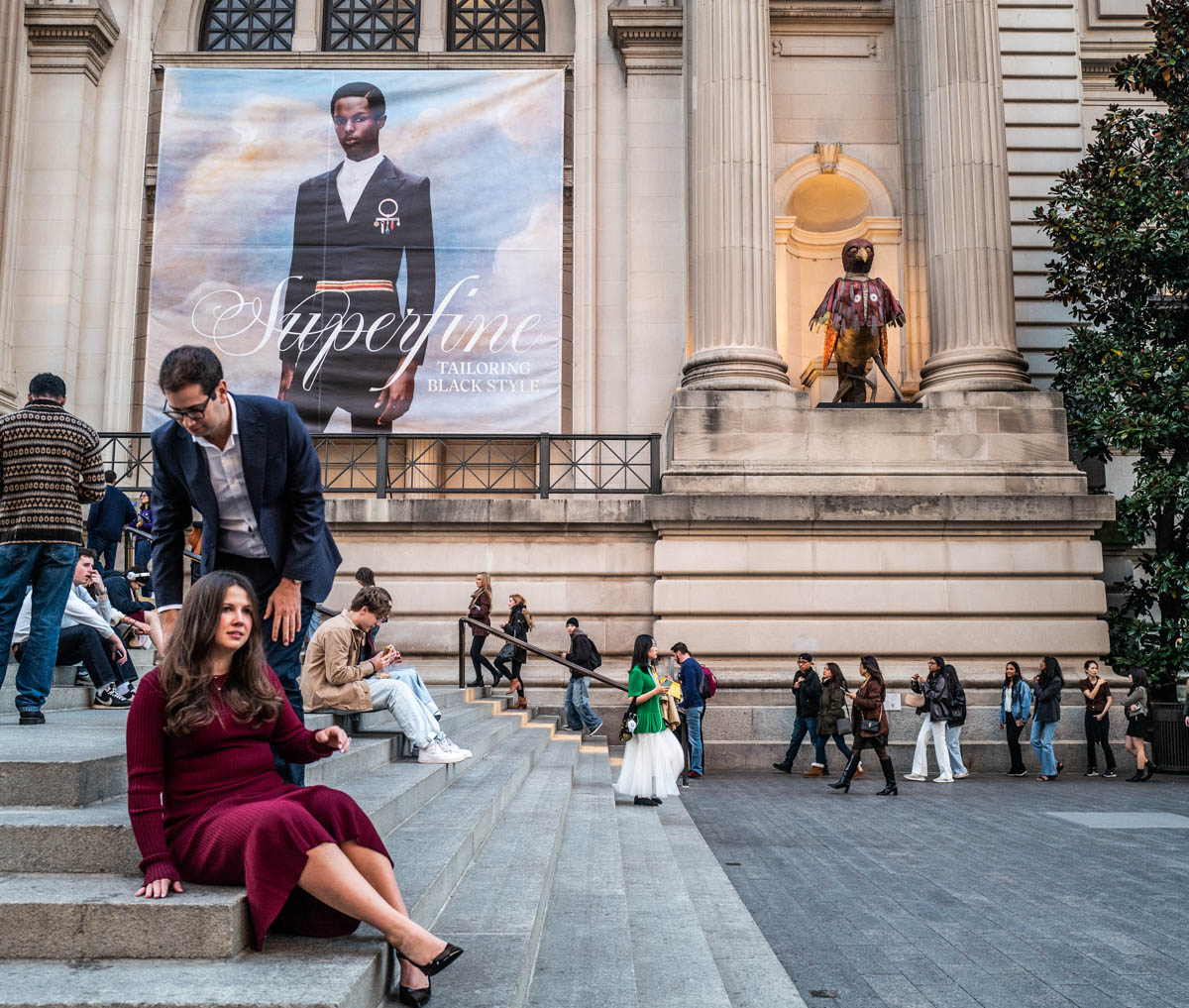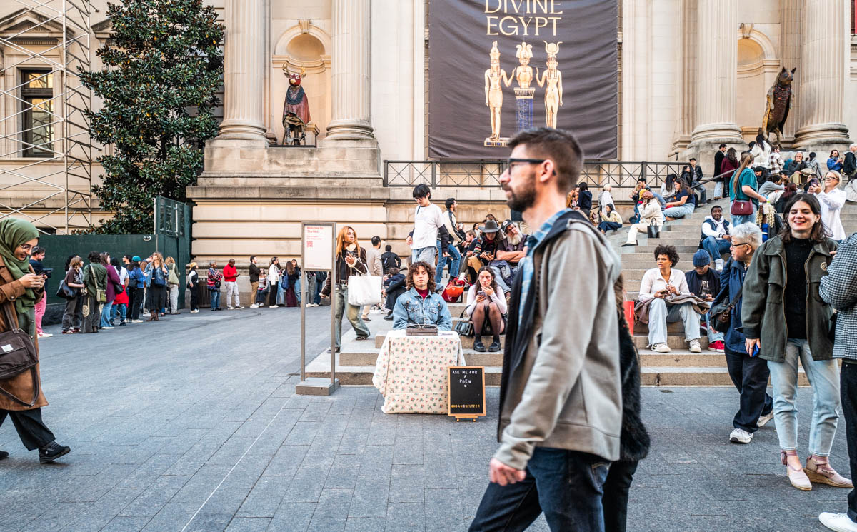 Ci spostiamo ora nell’Upper East Side e andiamo al Metropolitan Museum, senza entrarvi. L’artista interdisciplinare Jeffrey Gibson ha trasformato le nicchie della celebre facciata del Metropolitan Museum con una serie di quattro grandi sculture che esplorano le relazioni metamorfiche tra gli esseri viventi e l’ambiente. Membro della Mississippi Band of Choctaw Indians e di origini Cherokee, Gibson ha uno stile distintivo che fonde visioni del mondo e immagini con astrazione, testo e colore.