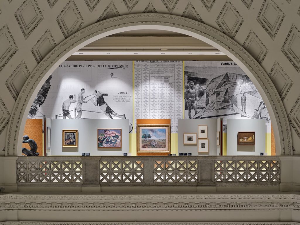 «L’omaggio storico negli ambienti a livello superiore risponde a logiche di progetto del tutto diverse da quelle adottate al piano inferiore. La colossale mostra del 1935 che, all’epoca, rappresentò il panorama dell’arte italiana con circa 1800 opere di 700 artisti, è proposta attraverso una selezione ragionata di capolavori e tradotta mediante un allestimento concretamente estroverso, che interpreta i colori di riferimento delle architetture di quella edizione ed espone le opere – dipinti e sculture – e i tanti documenti d’archivio attraverso una progressione lineare potenziata da un carosello iconografico di grande formato, una sorta di fregio fotografico continuo di forte impatto visivo. Il progetto d’allestimento e quello grafico hanno qui un punto di contatto pieno, un’integrazione assoluta».