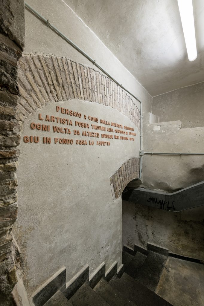 Il lettering in argilla Pensavo a come…, posto a metà dell’intero percorso della mostra come trait d’union metalinguistico, riflette sulla diversità espressiva come punto nodale e fondamento della ricerca artistica che rinnova l’ardimento e la volontà di esplorazione dell’inconosciuto. Nella modellazione della materia prima della scultura, il linguaggio foggiato in voci lessicali si amplia e diviene totalità plastica di forma e contenuto, principio compositivo e codice verbale, di nuovo coincidenza tra corpo e mente, manualità intellettiva e intelletto agente.