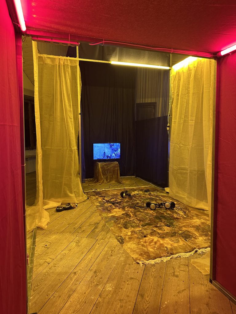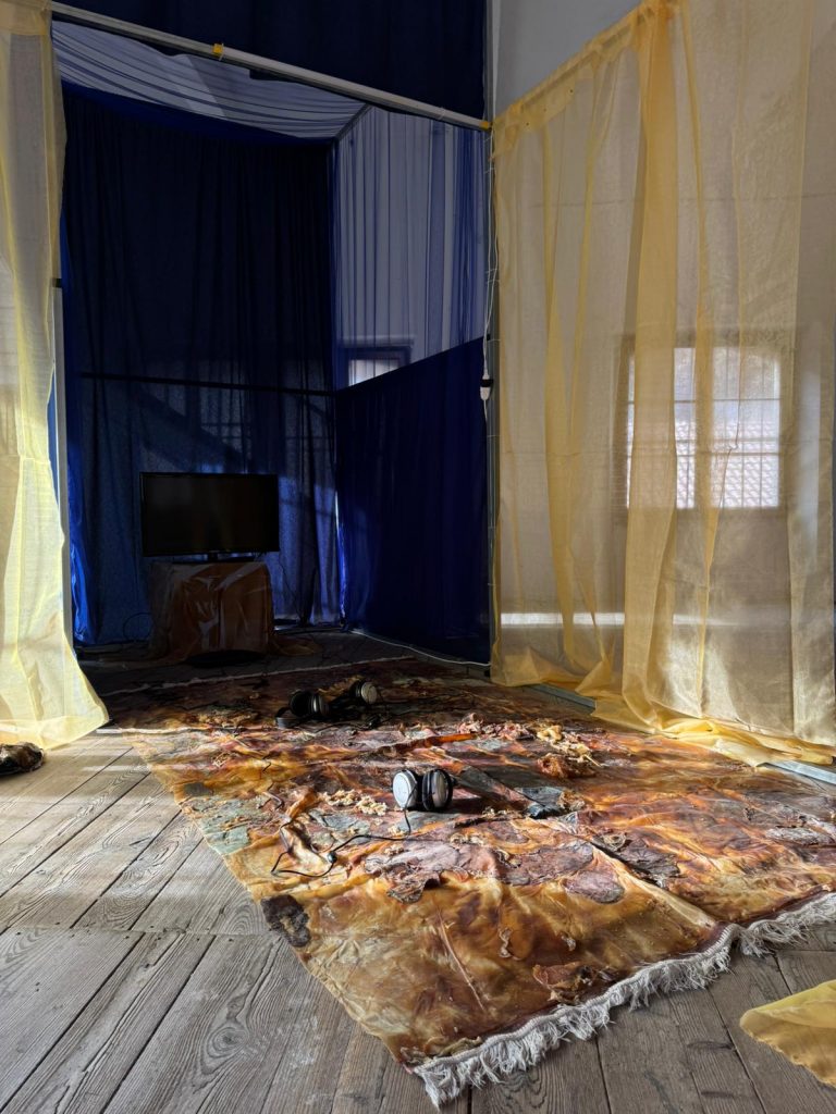 La soglia si espande poi nella dimensione spirituale evocata da Zabardast: a place to be di Giulia Tombolato, che custodisce al suo interno il Tappeto del non di Speranta Miruna Beato, un’intercapedine tra rituale laico e meditazione privata. Immagini, suoni, memorie s’insinuano con discrezione, trasformando il confine in una disposizione mentale. È qui che il visitatore riconosce la propria vulnerabilità rispetto allo spazio, un territorio senza appigli, privo di un nucleo a cui aggrapparsi.