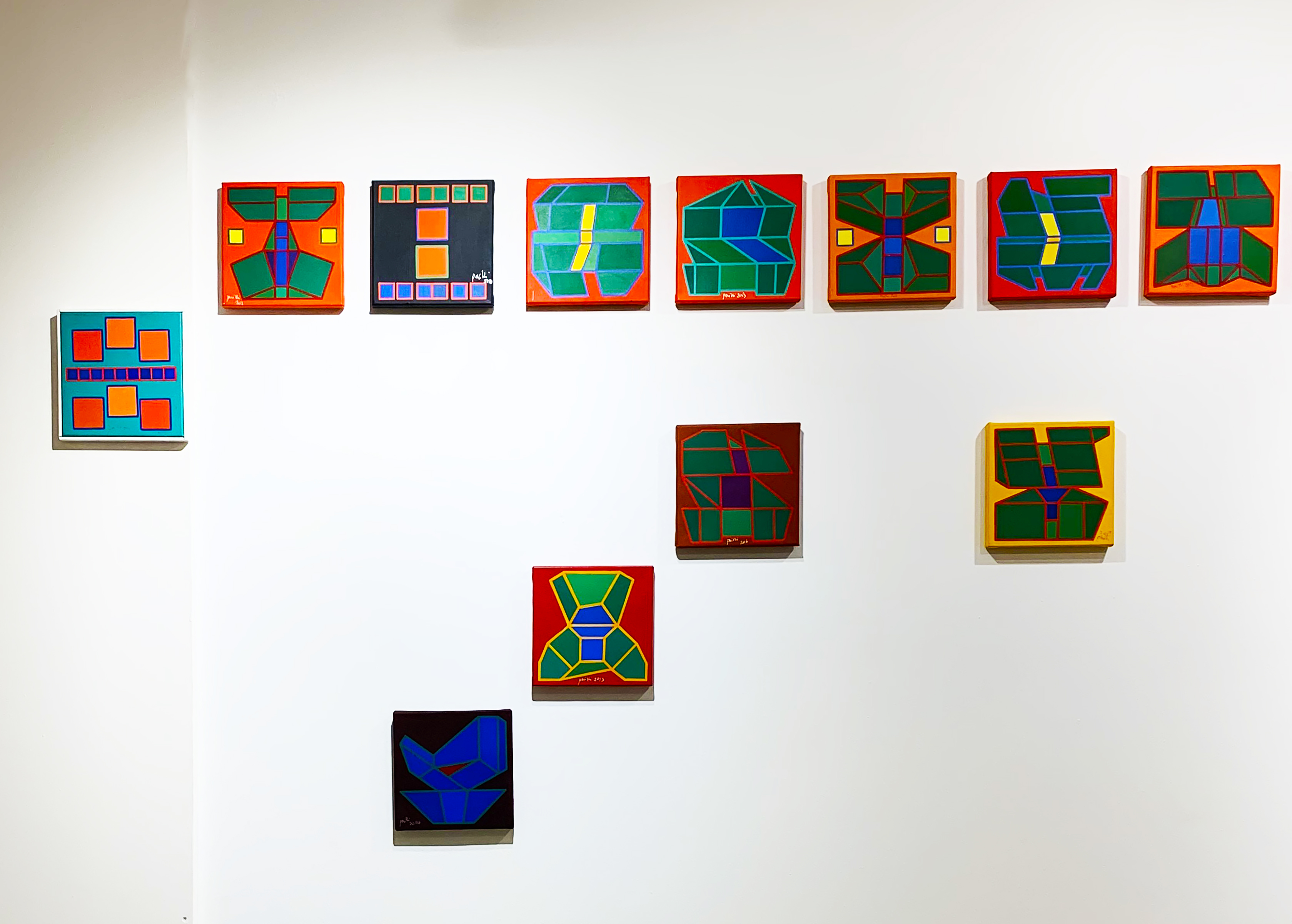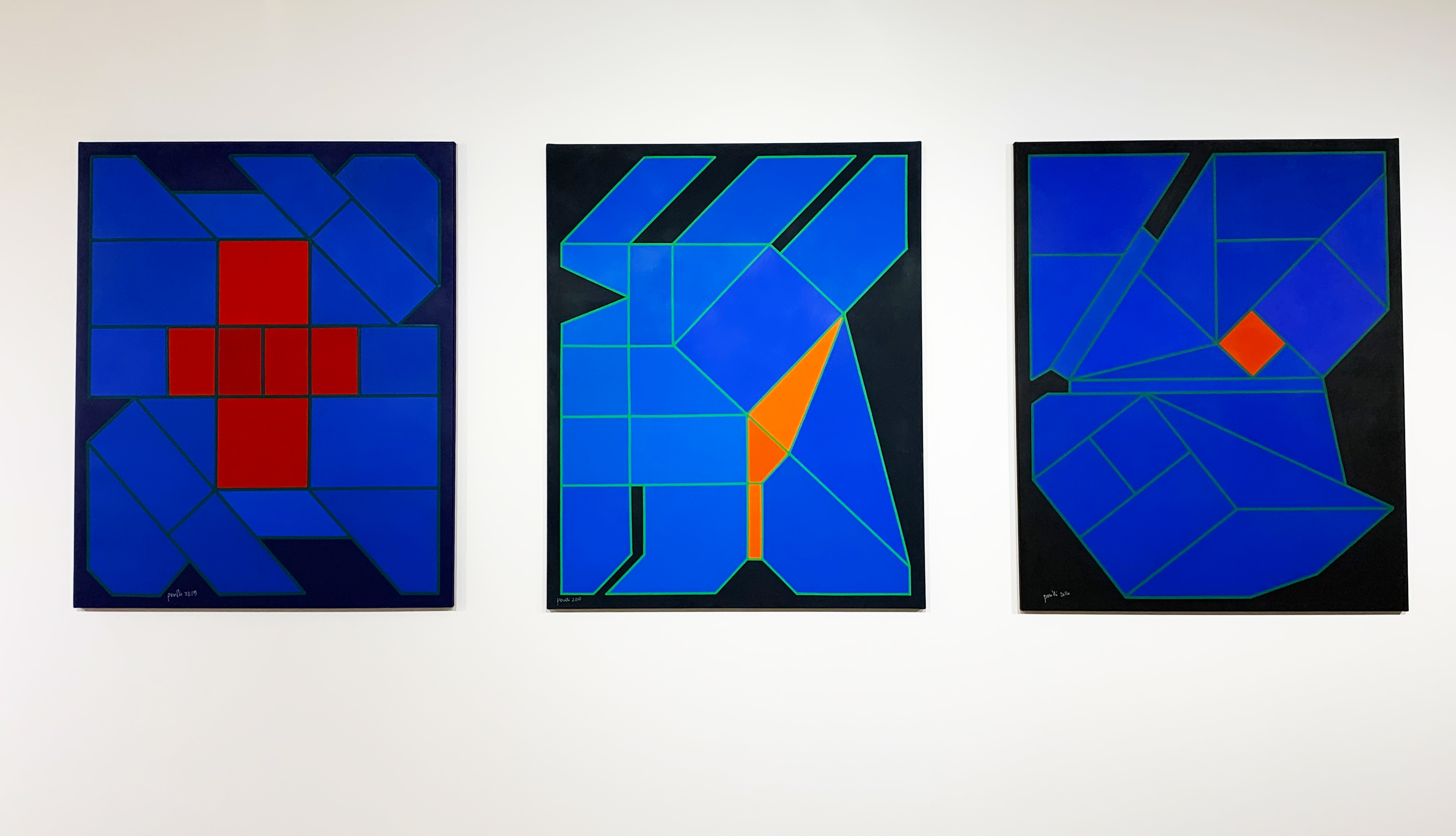 Nel secondo, al Vetrya Corporate Campus, la mostra si focalizza, con maggiore puntualità, sulla sua ultima attività, evidenziando gli esiti e l’attinenza di una prassi artistica saldamente improntata sulla ricerca sul colore, sulla forma e sulla geometria. Quest’ultima, concepita nella sua massima dimensione concettuale, viene radicalmente sovvertita come fosse un’assonometria liberata dai canonici obblighi assiomatici, ampliando il proprio respiro visivo a tutta l’estensione della superficie mediante l’impostazione di ragionati rapporti lineari contrassegnati da tonalità cromatiche spesso complementari o cangianti. In tale aspetto, il lavoro di Perilli, oltre a testimoniare una speculazione feconda e, al tempo stesso, analitica, si dimostra estremamente sensibile al mondo della grafica digitale e della virtualità, lasciandone trasparire, così, il potenziale avveniristico insieme alla propensione a superare i limiti di qualsivoglia statuto.