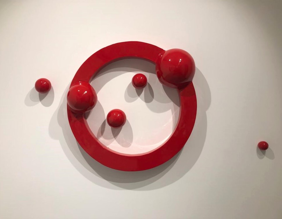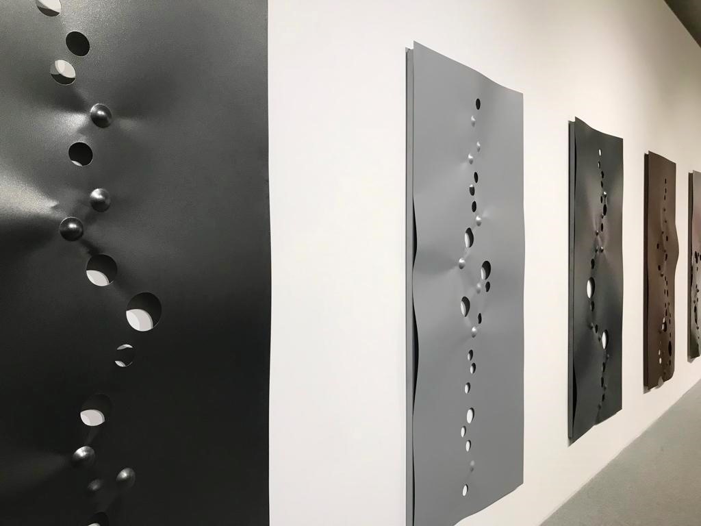 Lo dimostra a pieno titolo questa esposizione di Beatrice Gallori, già a partire dalla prima sala, in cui le sue “Bio_sphere” – un’installazione di lamine in acciaio di varie dimensioni – fluttuano nell’ambiente, ritmandolo. L’acciaio così modellato, opacizzato, assottigliato e piegato a una dialettica del pieno e del vuoto – come anche nella serie “Life_Code” e in “Neutron”- restituisce una sensazione di leggerezza che non gli è famigliare, di permeabilità all’aria, alla luce, allo sguardo.