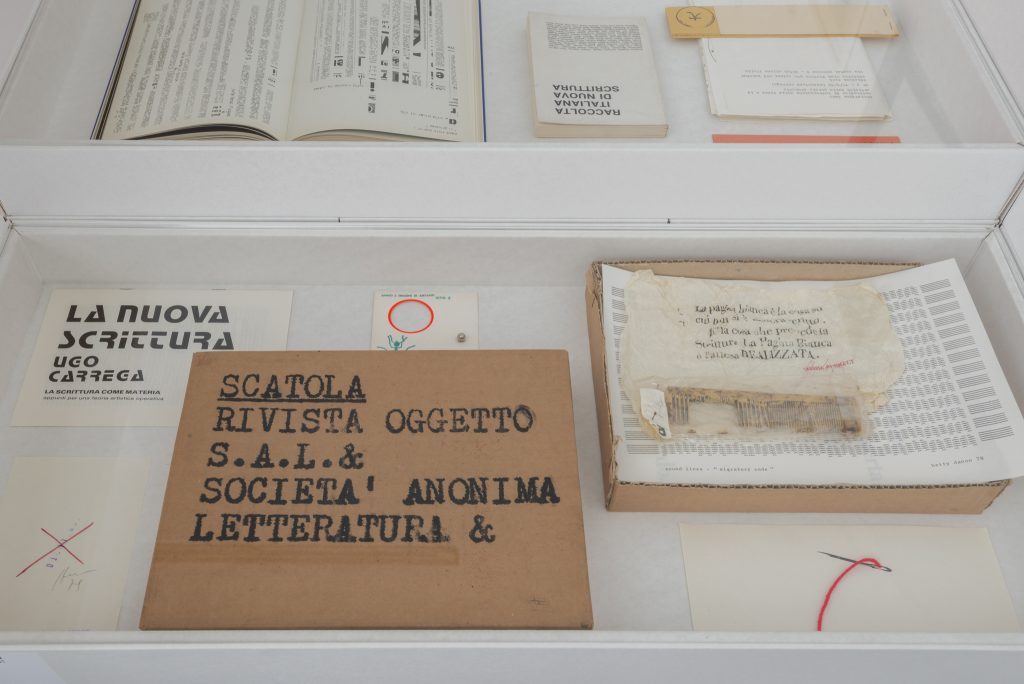 A legare le diverse voci è la ricerca per l’aspetto visivo della parola e del linguaggio, analizzato da Carrega nel concetto di scrittura simbiotica e che lo porterà a coniare il termine di Nuova Scrittura. Gallerista, poeta, traduttore ed editore Carrega è stato una figura poliedrica: mescolare le carte, sconfinare tra generi era parte essenziale del suo approccio. Sono quindi lavori sottili, indisciplinati e sfuggenti, da guardare e da leggere, quelli di Poetry in the box. Spesso il confine tra edizioni, opere e riviste è sfumato, come ad es. nella Scatola. Rivista oggetto di Carrega e Finotti. La parola è sempre protagonista, come fonte di infinite combinazioni di significato nei Permutatori manuali o diventa scultura mobile nel poemobile Love never keeps still. O, piegata, si fa oggetto nelle Verbosculture. In altri lavori non è solo la parola a farsi presenza fisica, ma anche il fisico a tradursi in parola, come nel sospiro del poeta (lungo e profondo) di Vincenzo Accame, che rievoca Bodies, mostra che raccoglieva frammenti corporali inviati da artisti di tutto il mondo. Tra le “chicche” anche le opere di Cards from the world (1973), una delle prime mostre di Mail art in Italia organizzate da Carrega. E poi l’edizione The Large Glass and Related Works, Vol. 2 1967-68, di Marcel Duchamp, artista a cui Carrega era particolarmente legato. Lo spirito duchampiano aleggia, del resto, su tutta la mostra, non solo per il concetto di scatola, in cui riecheggia la celebre Boîte-en-valise, ma anche per l’attenzione alla parola, alla sua forza e ai suoi enigmi che pervade le opere. E comincia dal nome scelto per lo spazio, Mercato del Sale, che altro non è che la traduzione dello pseudonimo dell’artista francese, Marchand du Sel. Fino all’ 1 settembre 2024.