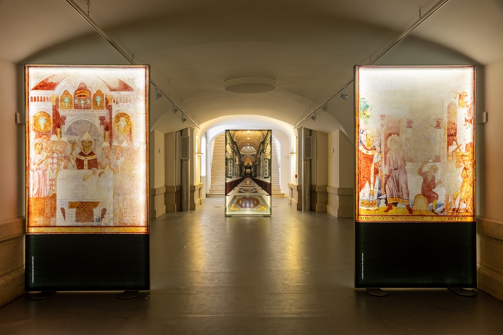 Il percorso espositivo prevede un articolato apparato iconografico corredato da pannelli che propongono approfondimenti sia sul piano storico che storico-artistico. Si tratta di una parte complementare rispetto all’esperienza della sala immersiva che, grazie al supporto di avanzate tecnologie di modellazione digitale 3D e realtà virtuale, restituisce, attraverso la proiezione sulle pareti e sul pavimento, l’aspetto dell’antica basilica di San Pietro dei tempi di Innocenzo III e dettagli ravvicinati della preziosa lunetta della Nicchia dei Palli di cui si può così apprezzare a pieno la raffinata fattura e il ricco apparato iconografico.