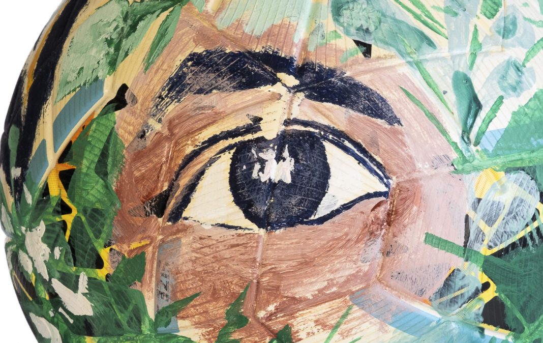 Così, la galleria si trasforma in un campo di gioco, utilizzando erba verde artificiale su cui Dolcetti ha disegnato linee, curve, dischetti per creare uno spazio laboratorio coinvolgente. Tra scultura e pittura, pur mantenendo la possibilità di oggetti essenziali al gioco, sono i palloni le opere principali in mostra. Sono ricoperti di vegetazione e tra le foglie sbucano uno o più occhi, con zigomi e sopracciglia.