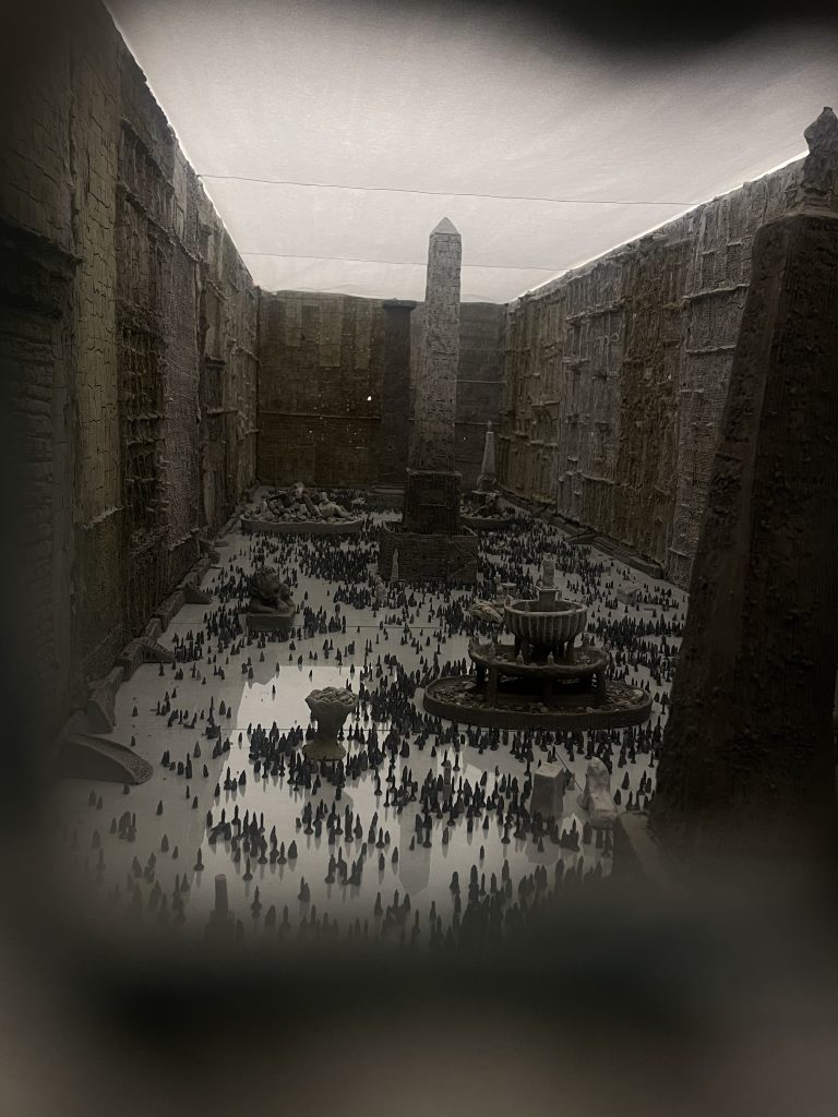 Ai lati dell’installazione sono state apposte delle acquetinte realizzate da Sasha Brodksy, con una tecnica imparata nel corso di un workshop di un artigiano specializzato in tecniche incisorie a Firenze. Le stampe sono disposte lungo le pareti della Fondazione e sono in dialogo con l’interno dell’installazione (anch’essa, come le stampe, concepita e creata nelle due settimane precedenti all’apertura della mostra). Incisioni su carta che raffigurano quei monumenti, quelle piazze e quegli obelischi che danno forma al panorama interno alla massa in terra cruda che protegge (o imprigiona?) gli abitanti della città immaginaria dalla realtà esterna. Una di esse è invece realizzata su tela e offre una prospettiva ravvicinata su quello che potenzialmente sta accadendo all’interno della struttura. Un dettaglio, uno scorcio di una città racchiusa tra quattro mura che in qualche modo spersonalizza quelle vite rinchiuse. Una grande piazza anonima in cui manca l’aria, un po’ come nelle grandi città contemporanee: vive, dinamiche, eppure asfissianti per una collettività di individui sempre più soli.
