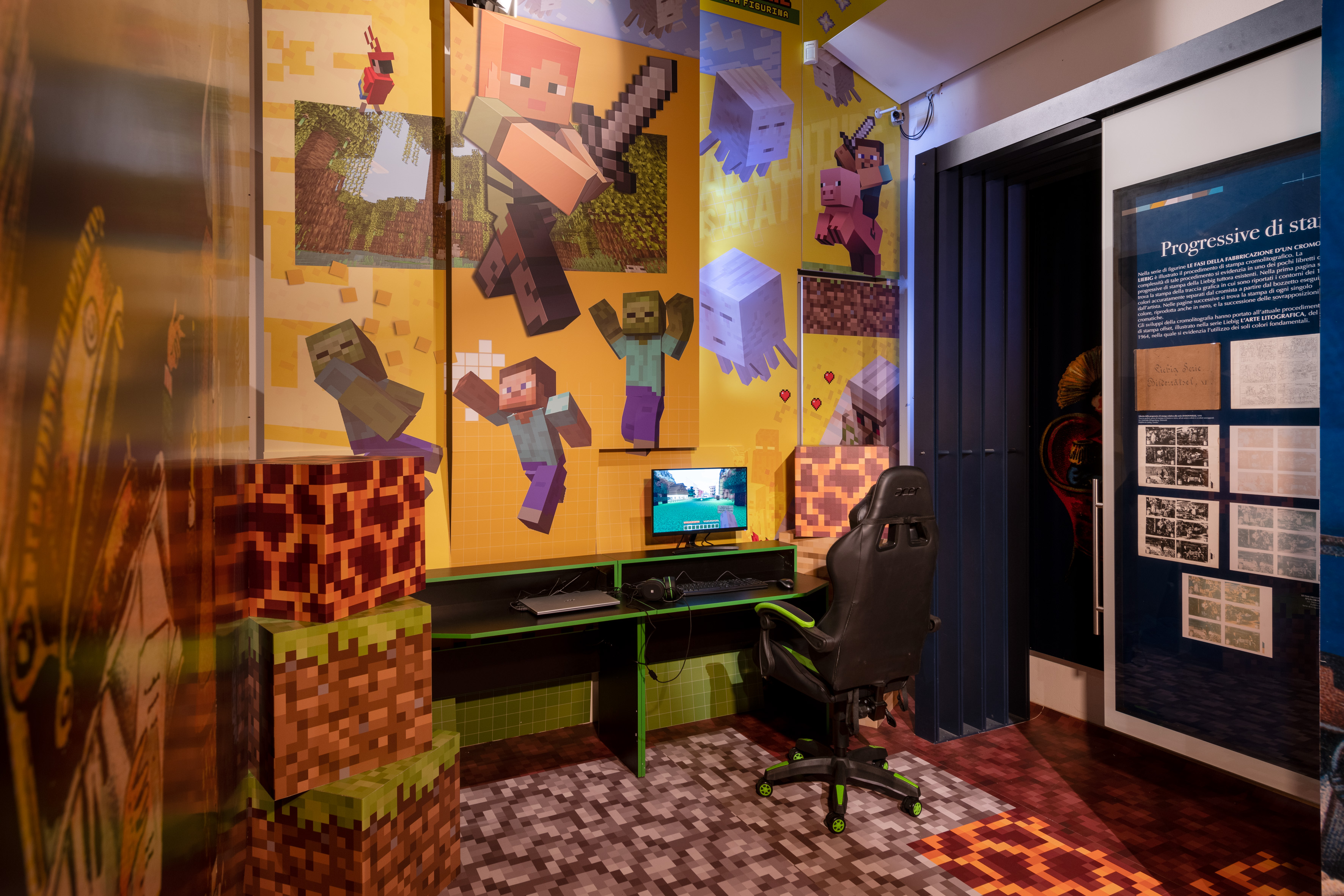 Sempre a Palazzo Santa Margherita, al Museo della Figurina, visitabile anche “Minecraft Museum Adventure. Viaggio nel mondo della figurina”, progetto a cura di Francesca Fontana e Lorenzo Respi. Creato nel 2009 dallo sviluppatore svedese Markus Persson, detto “Notch”, Minecraft è il videogioco multipiattaforma più diffuso al mondo, con 238 milioni di copie vendute. Grazie alla particolare dinamica di gioco, che permette di esplorare liberamente un mondo 3D costituito da blocchi in stile vagamente Lego, Minecraft è considerato non solo un passatempo ma anche un utile mezzo di apprendimento e uno strumento per sviluppare la creatività, la logica, il pensiero computazionale e le capacità di problem solving, visto che, utilizzando i vari “materiali” messi a disposizione si può costruire praticamente di tutto.