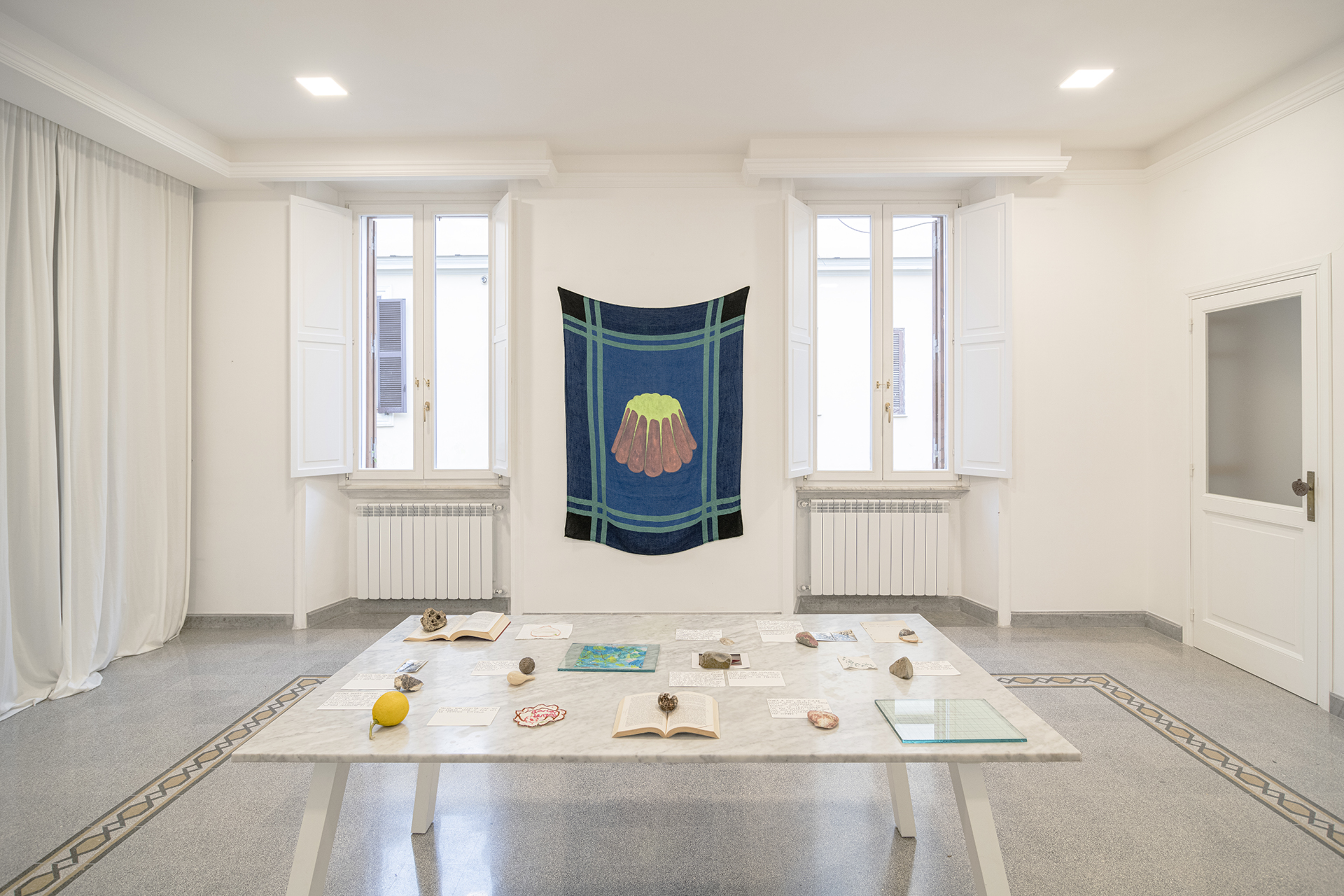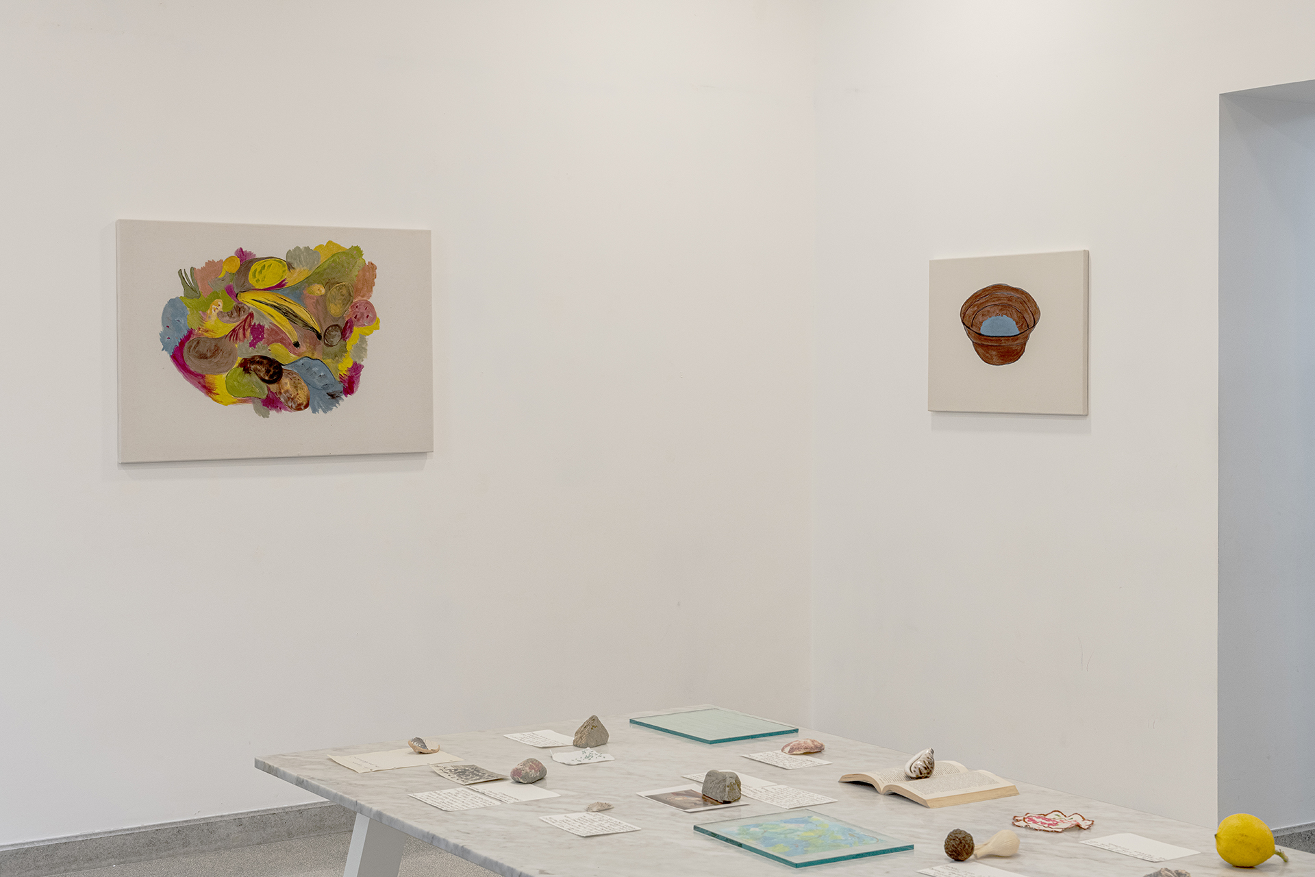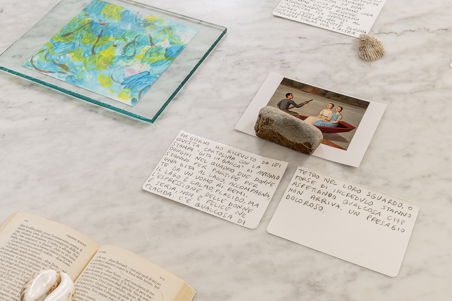 La noce, il budino, il limone, sono tutti elementi che appaiono nei carteggi immaginati dall’artista e ricorrono come simboli durante la mostra, generando una sorta d’iconografia della relazione, che ritroviamo sia nelle opere pittoriche sia sul grande tavolo in marmo posto al centro della sala principale (in origine, il soggiorno). Sopra di esso, troviamo alcuni brani delle lettere ideate dall’artista, così come di quelle tra Virginia Woolf e Vita Sackville-West, oltre a fotografie d’archivio e piccoli dipinti, pietre e tessuti ricamati, conchiglie, libri e oggetti vari che compongono, anche per mezzo di altre vite, la biografia di un’amicizia.