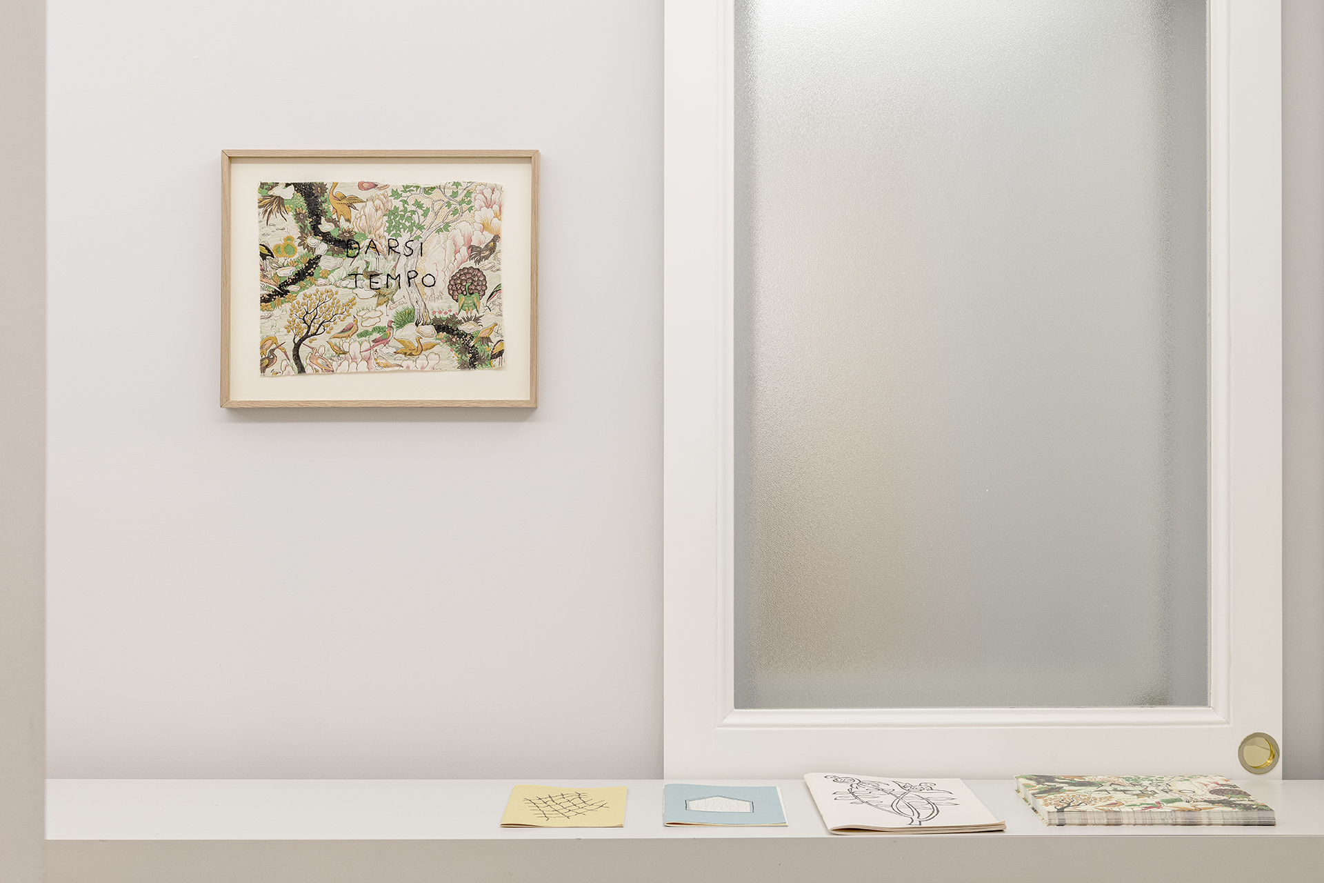A perfetta conclusione di un cerchio, il percorso espositivo si chiude (o si apre?) con un’opera che riassume molti dei temi che si sviluppano nella mostra. Darsi tempo (2024) è un invito ricamato su un tessuto dalla fantasia colorata e rigogliosa, molto delicata all’apparenza, ma che racchiude un’attenzione fondamentale della costruzione di rapporti amicali (e non).