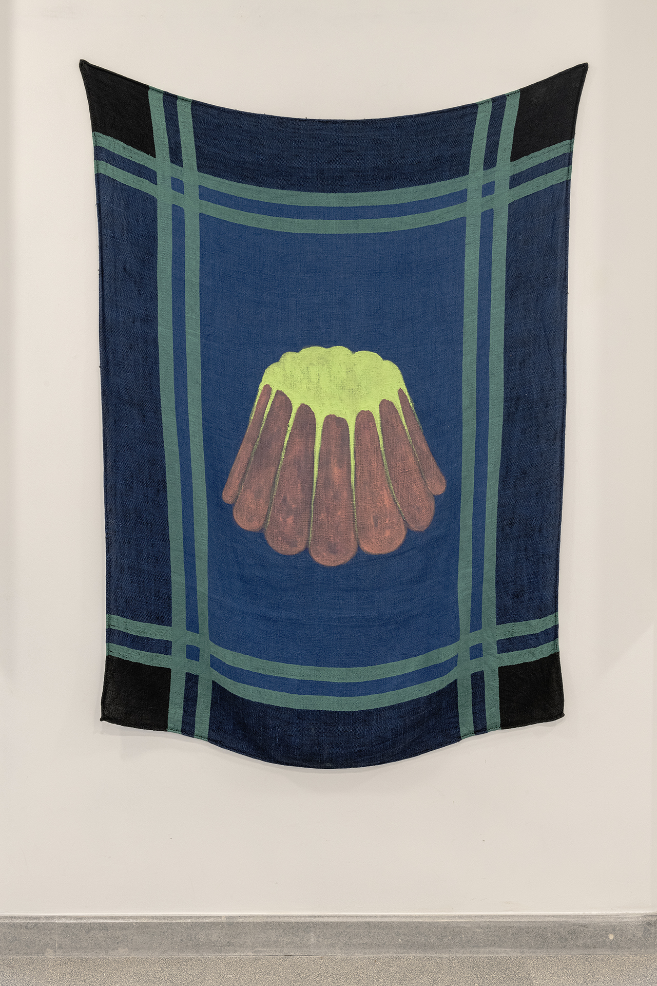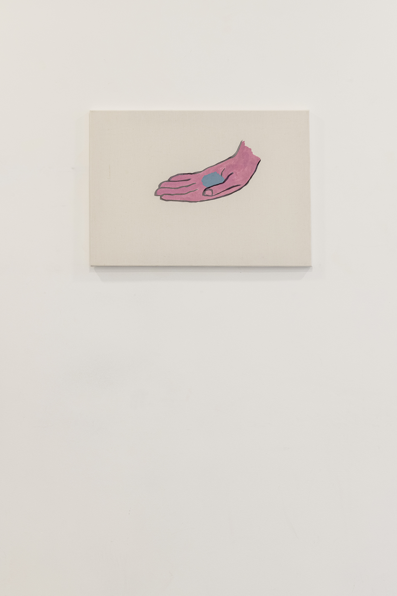 Intorno, appesi alle pareti, vediamo grandi dipinti realizzati su scampoli e tovaglie, dove ritornano le icone di questa relazione ormai conclusa, che si ripetono come a comporre un alfabeto della perdita, in un tentativo di razionalizzazione della stessa. Tra le opere esposte, le due facenti parte della serie Raccogliere l’acqua (2023) sono leggermente antecedenti al progetto ma gli sono tematicamente complementari, poiché riflettono su un’idea di cura che è insita in tutto il lavoro dell’artista. Sia la mano, sia la ciotola contengono al loro interno, raccolgono, per l’appunto, svolgendo un’azione di custodia e di cura, che è propria delle relazioni di amicizia, in particolar modo se guardiamo alla dimensione più femminile.