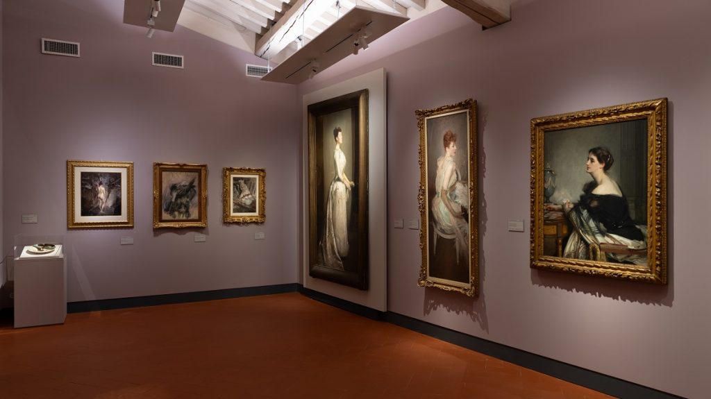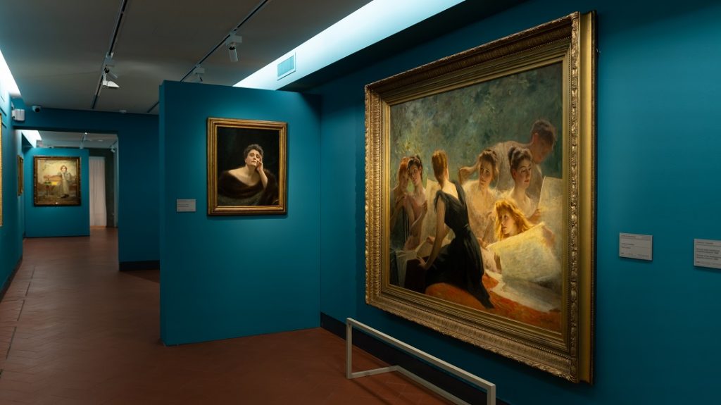 La mostra si divide in nove sezioni tematiche, ognuna concentrata su un aspetto di quell’epoca, da cui emerge una produzione pittorica che intreccia tradizioni diverse tra Italia e Francia, non dimenticandosi della serie di eventi che hanno condizionato questo periodo, di cui gli stessi artisti sono stati attenti osservatori: la seduzione e l’apparente frivolezza della rappresentazione, infatti, sono il segnale del cambiamento dell’interesse nella pittura, dai temi al formato, fino alla modalità di fruizione. Boldini, De Nittis e Zandomeneghi mostrano nelle sale il loro diverso approccio con la modernità parigina: approcci mondani, narrative o scorci di quotidianità vicini all’Impressionismo solcano le mura di Palazzo Blu, in una Parigi vista attraverso il filtro della memoria culturale italiana, tra Firenze, Napoli e Venezia, e delle amicizie strette dai pittori con gli altri eminenti artisti europei della città.