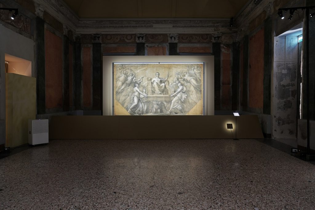 Sotto il governo di Maria Teresa e Ferdinando d’Asburgo Milano attraversa una fase di grande splendore, nella quale artisti e architetti lavorano alacremente per adeguare al gusto neoclassico i luoghi principali della patinata aristocrazia cittadina. Di questa fase, il cantiere di Palazzo Reale è forse l’esempio più illustre: coordinato da Giuseppe Piermarini, prodigioso allievo del Vanvitelli, il progetto coinvolge numerosi artisti di fama come Albertolli, Traballesi, Levati e lo stesso Appiani. Con l’avvento del Triennio rivoluzionario e il consolidamento del potere di Napoleone, il Palazzo Reale di Milano viene destinato a reggia imperiale ed è in questa fase di transizione che ad Appiani vengono commissionate le decorazioni più importanti. Di questo monumentale cantiere la mostra propone due esempi di rilievo: un grande cartone preparatorio proveniente dalle collezioni del Louvre e raffigurante l’Apoteosi di Napoleone, e un’installazione di forte impatto nella Sala delle Cariatidi con la quale viene ricostruito il fregio dedicato ai Fasti di Napoleone, impresa pittorica condotta da Appiani tra il 1800 e il 1807 e andata distrutta, insieme al resto delle decorazioni della sala, nei bombardamenti del ’43.